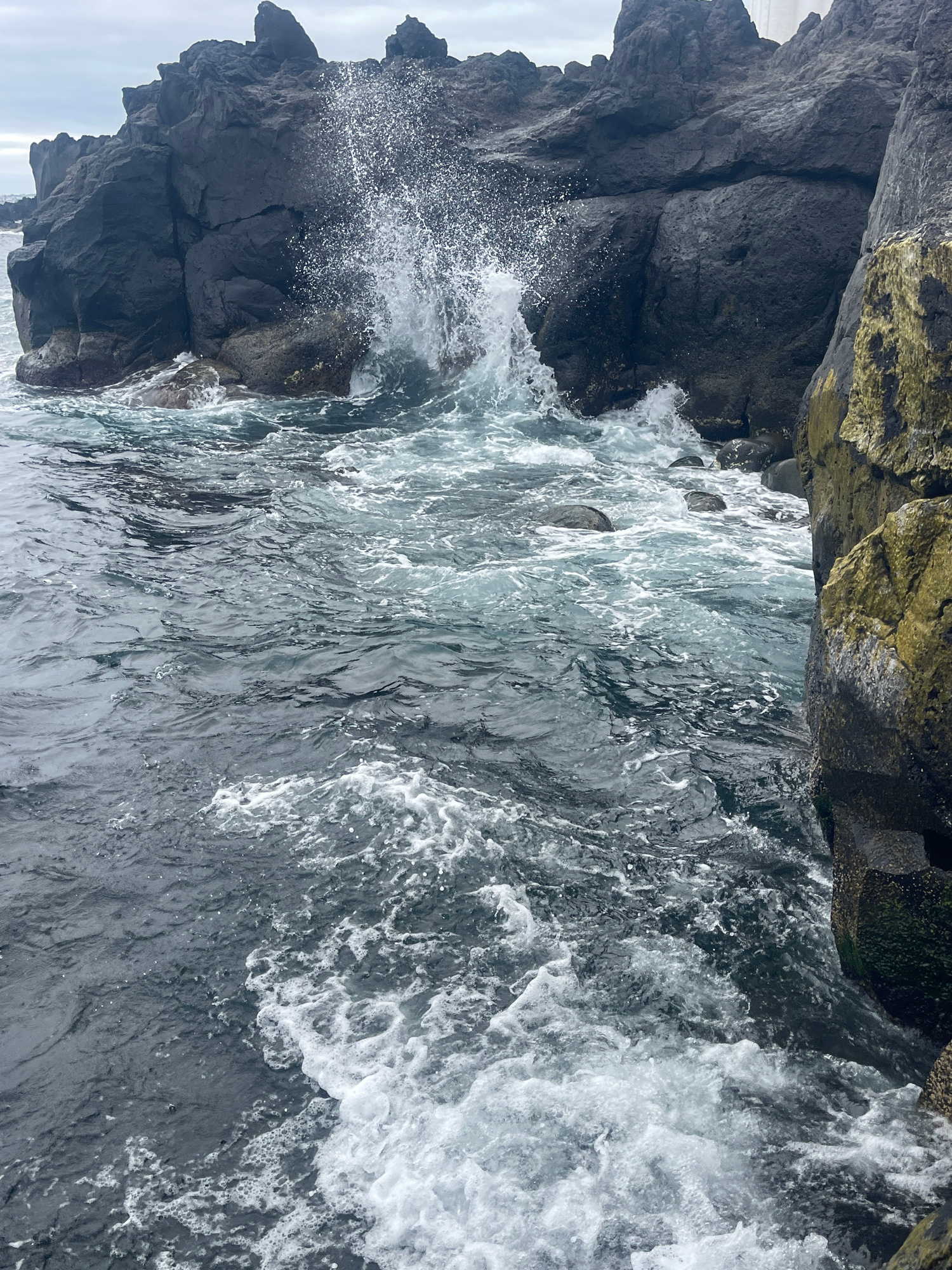 The image depicts a rocky coastal scene in Lagoa (Nossa Senhora do Rosário), Portugal, where waves are crashing against the rocks. The rocks are dark grey, with some areas covered in moss. The ocean i…read more