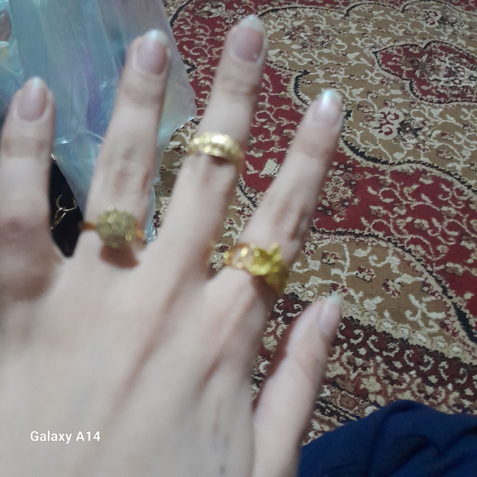 A close-up, blurry photograph taken with a Samsung Galaxy A14 mobile phone shows a person's hand wearing three gold rings. The background is a patterned carpet with red and brown tones. A portion of b…read more