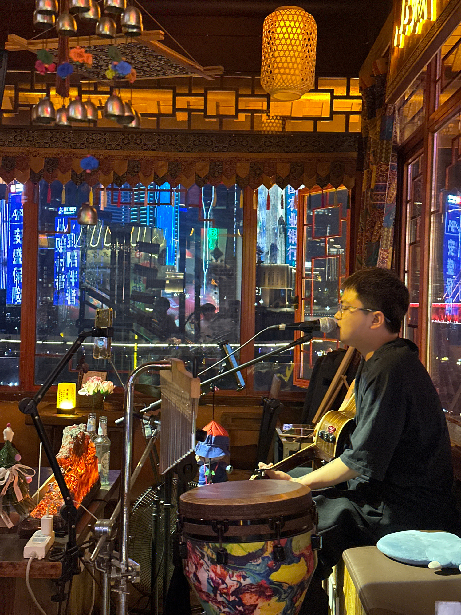 A musician in Yuzhong District, China, plays a guitar and drum while singing into a microphone. The scene, likely inside a building, is intricately decorated with a woven lantern, decorative screens,…read more