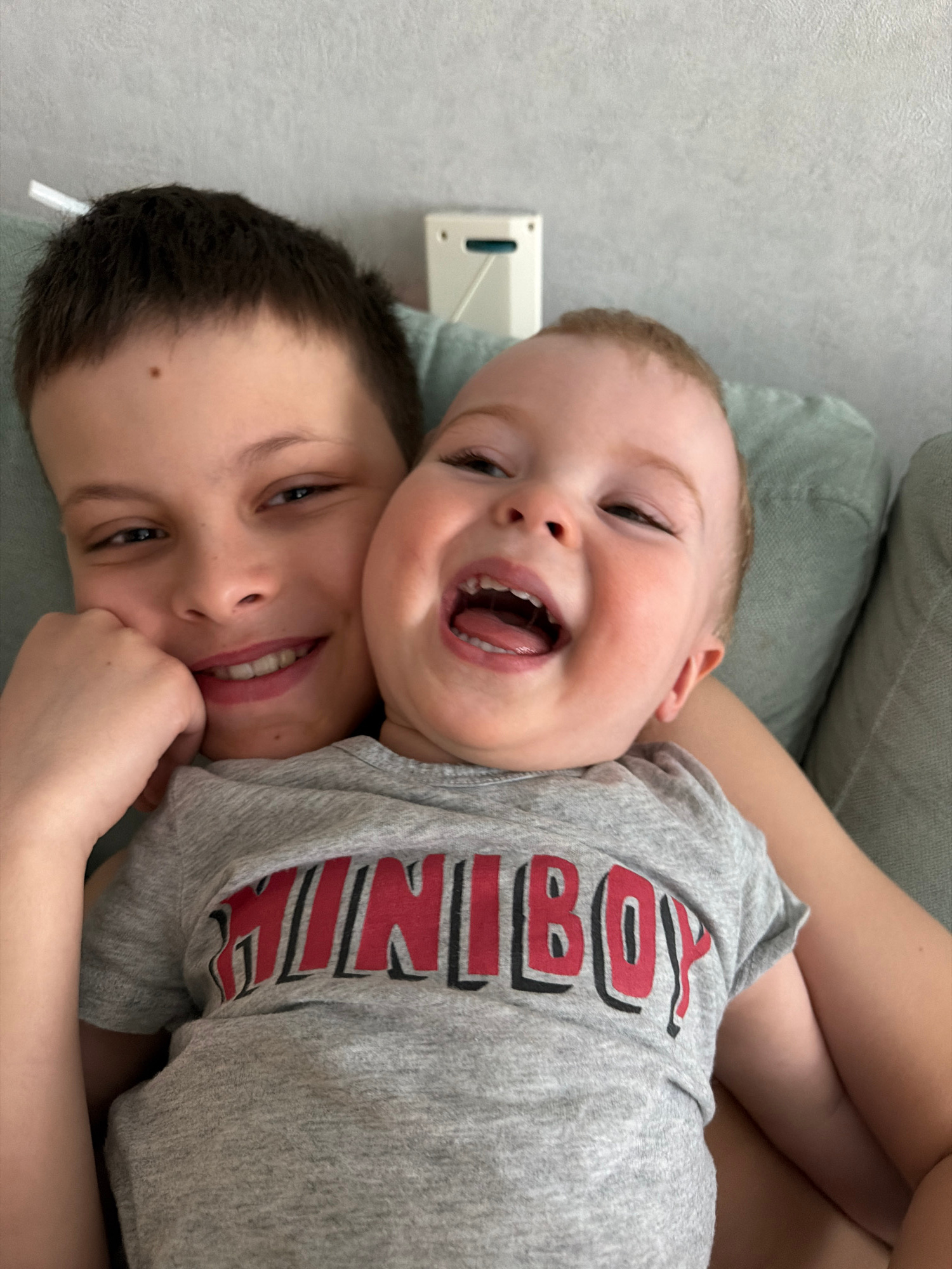 Two young boys are lying together on a soft, green-colored surface, likely a couch or cushion. The older boy, with dark hair and a mole on his cheek, is on the bottom, smiling and looking directly at…read more