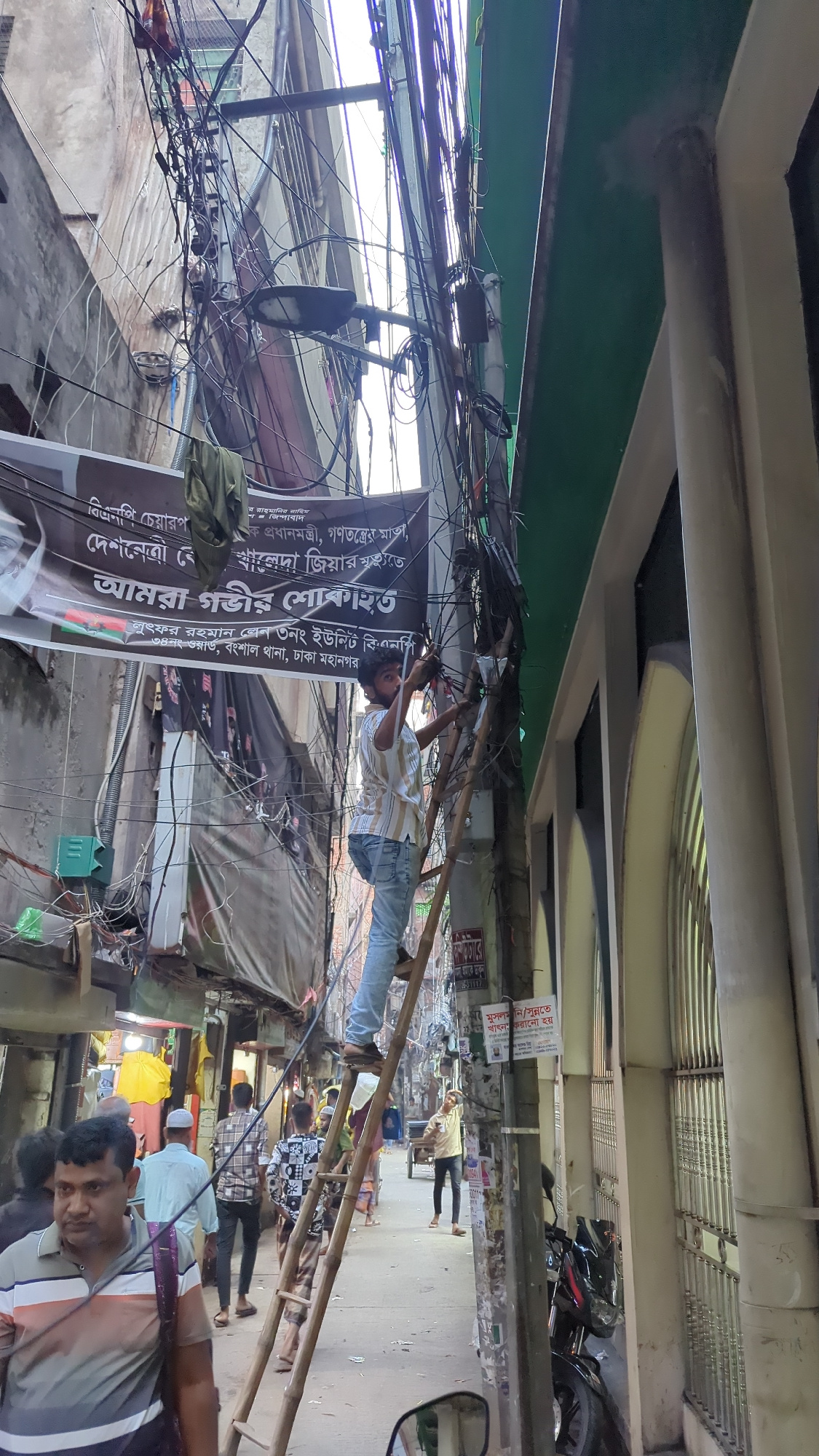 The image depicts a man on a bamboo ladder working on tangled electrical wires in a densely populated urban area, likely in Dhaka, Bangladesh. The scene is chaotic with numerous wires crisscrossing ov…read more