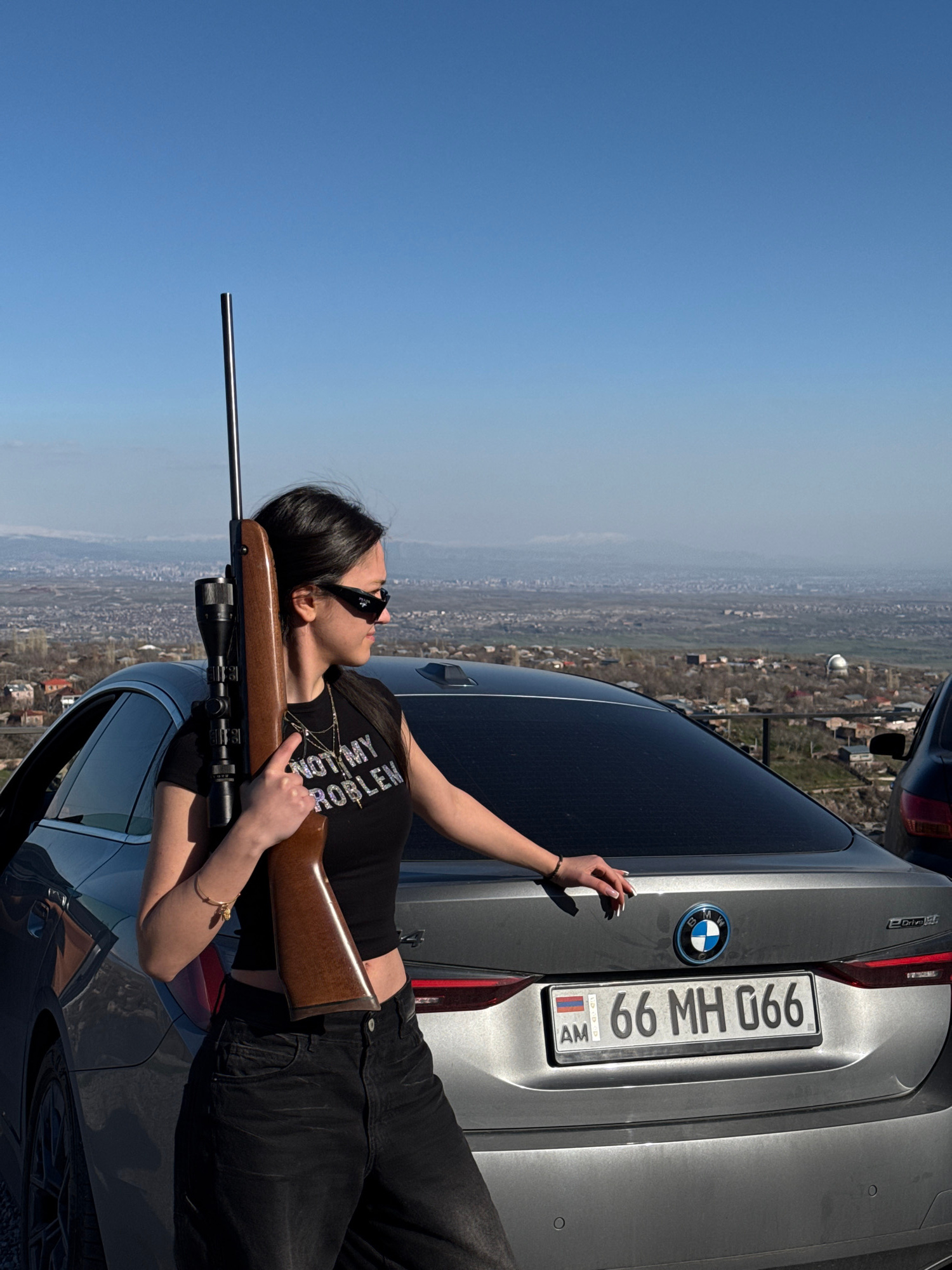 This media file captures a young woman posing with a rifle next to a gray BMW car, set against a panoramic view of a valley. The image is taken outdoors on a clear, sunny day in what appears to be a h…read more