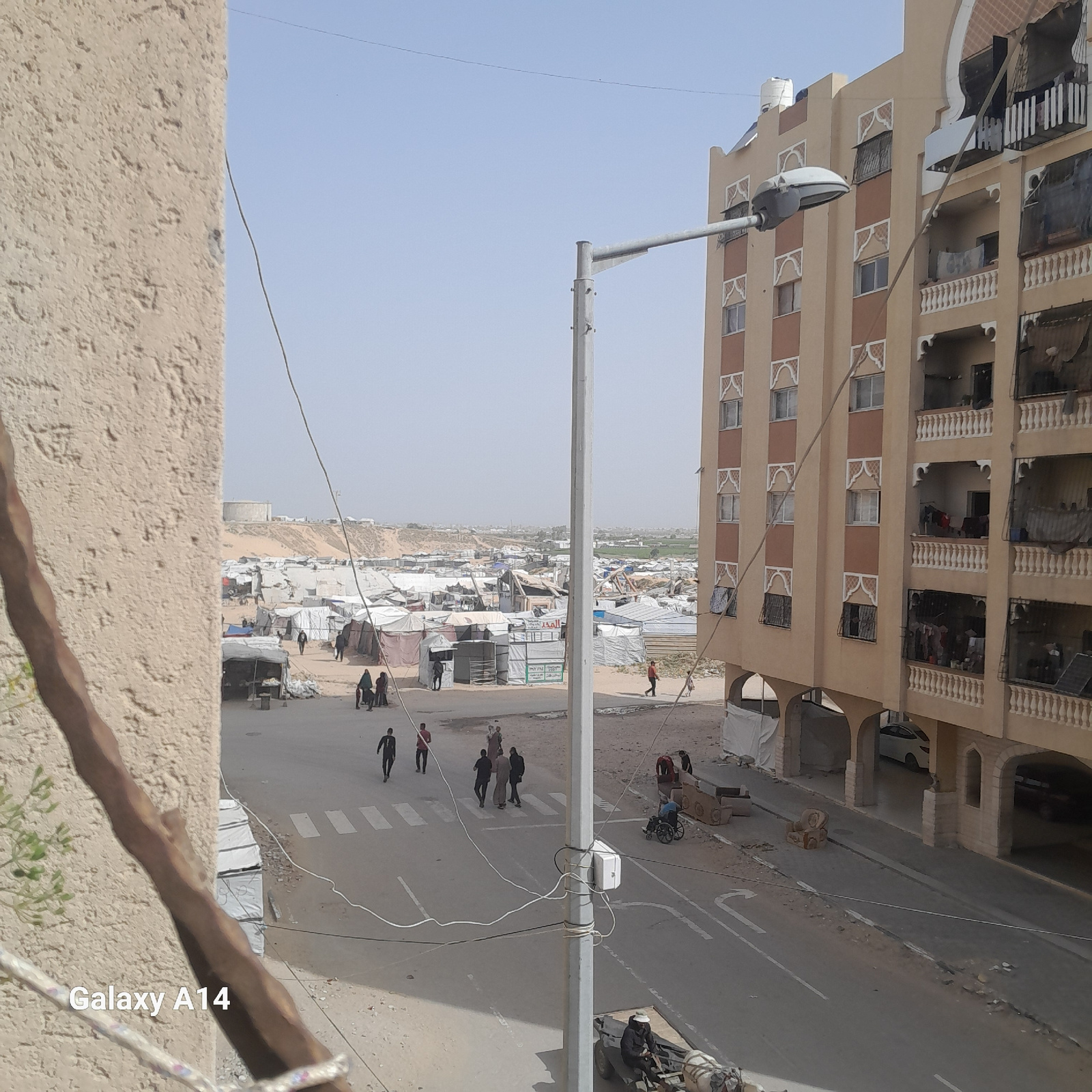 The image, taken in Khan Yunis, Palestinian Territory, depicts a street scene viewed from an elevated perspective. A multi-story building with ornate architectural details is on the left. A street run…read more