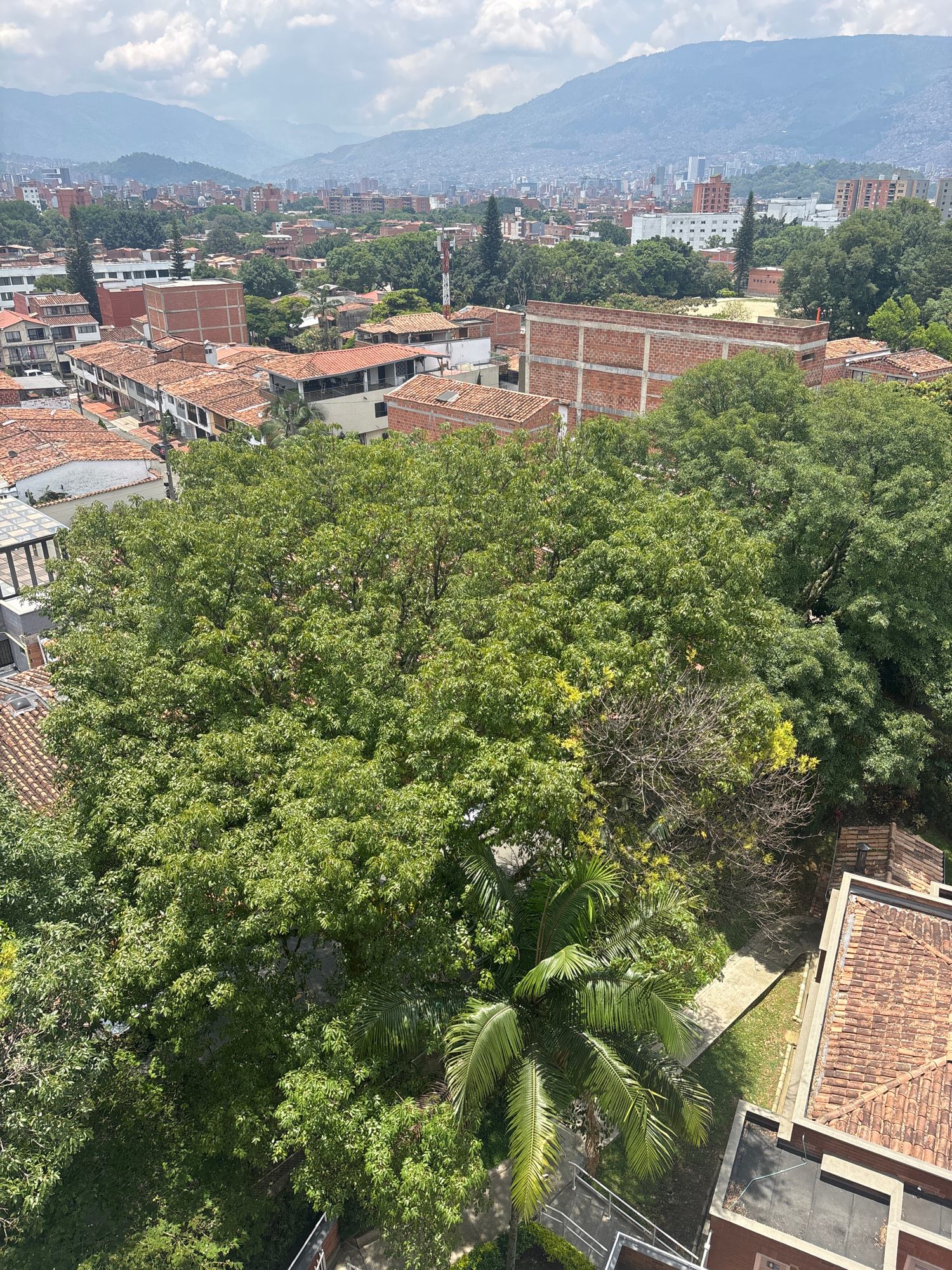 This image depicts an aerial view of a neighborhood in Medellín, Colombia. The foreground is dominated by lush green trees interspersed with buildings, predominantly featuring red-tiled roofs. A multi…read more