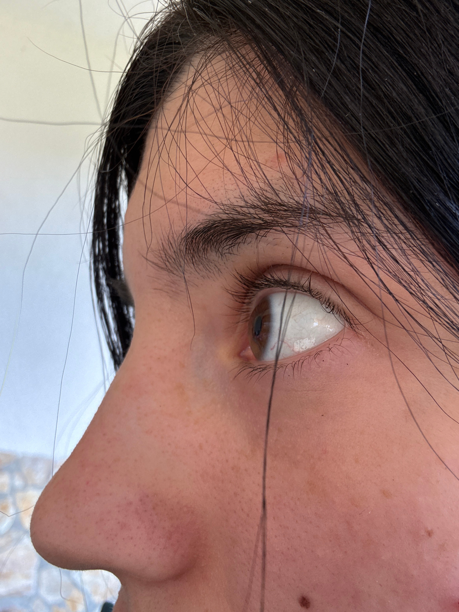 The image shows a close-up of a person's face from a low angle. The person has dark hair, and their right eye is visible, with a white sclera and brown iris. The surrounding skin shows freckles and bl…read more
