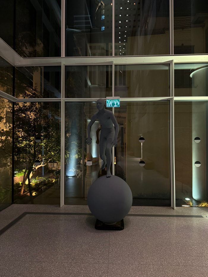 The image displays a low-light view of an indoor or semi-enclosed public space, characterized by modern architecture featuring large glass panels and light-colored frames. A central, monochromatic gre…read more