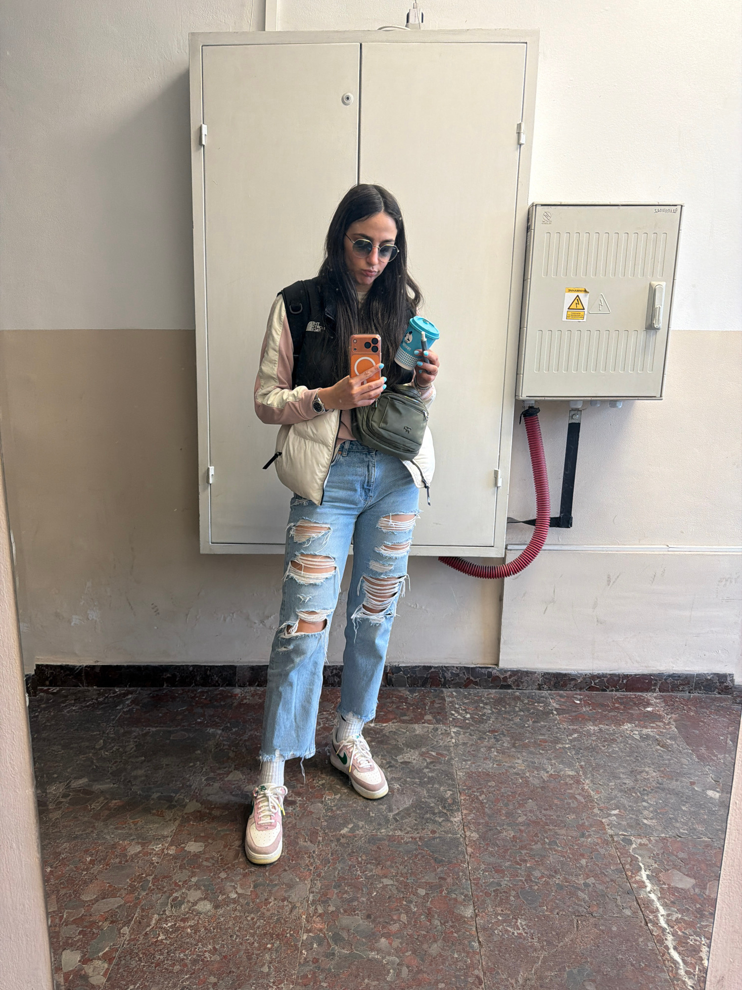 A young woman is taking a selfie in a hallway. She's holding a phone in one hand and a blue coffee cup in the other. She's wearing ripped jeans, sneakers, a puffer jacket, and sunglasses. The hallway…read more