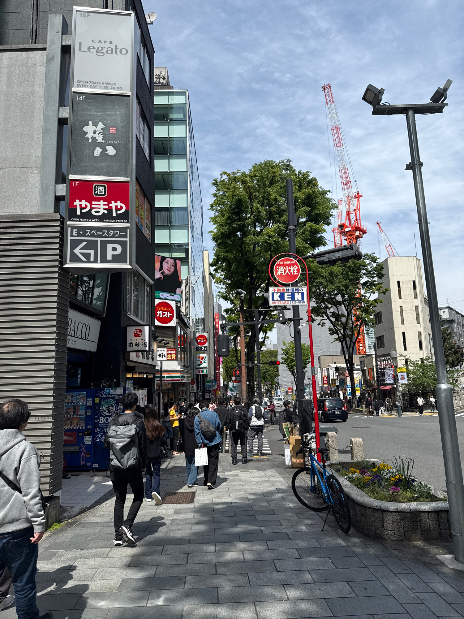 This is a street scene in Shibuya, Japan. The photo is taken from a sidewalk, looking down a city street with pedestrian crosswalks. A group of people is walking across the street. The street has manyβ¦read more