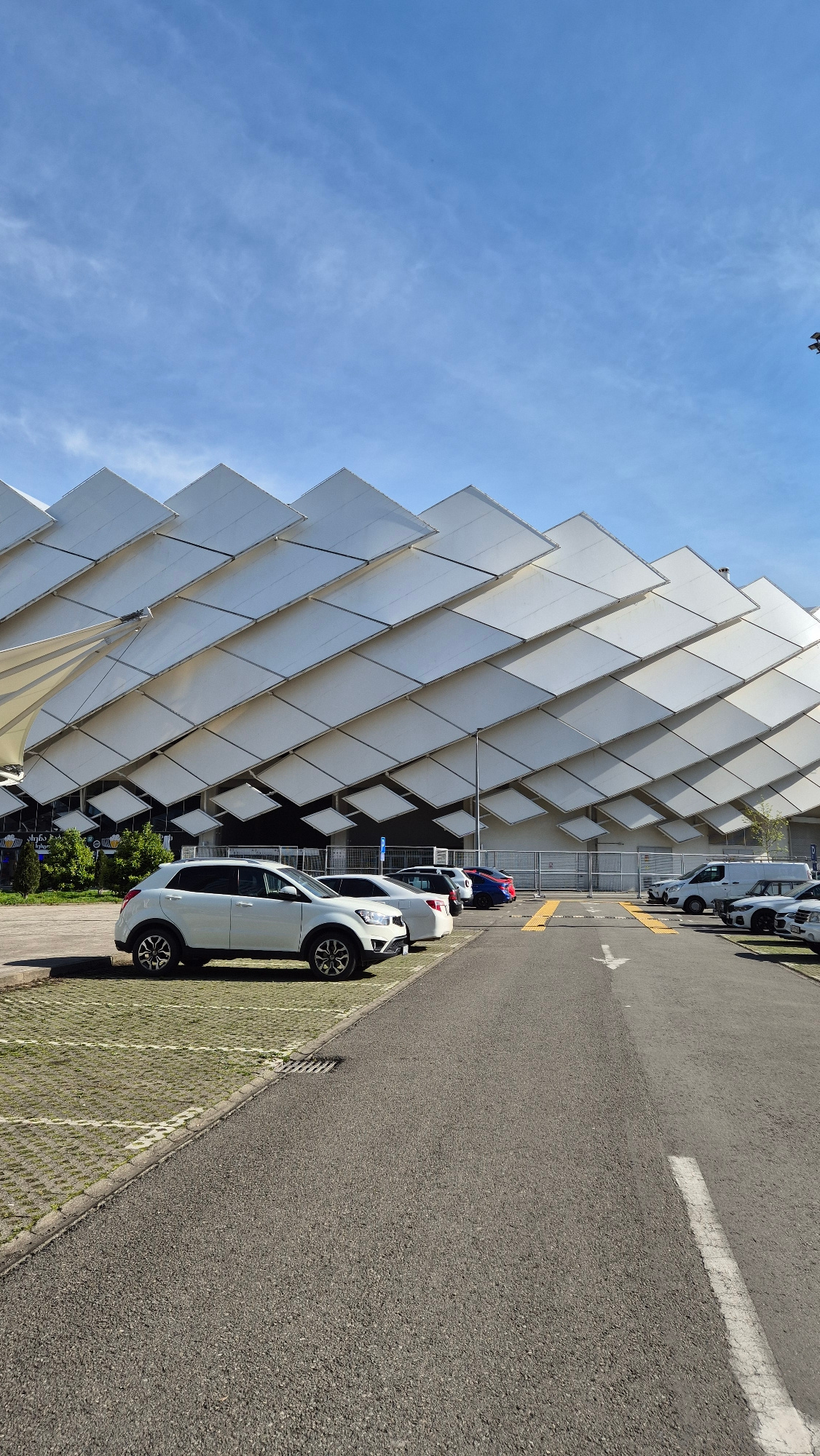 The image shows a section of the Piazza Batumi in Batumi, Georgia. The architectural facade is a multi-tiered diamond pattern design, constructed from what appears to be white or light-colored panels,…read more