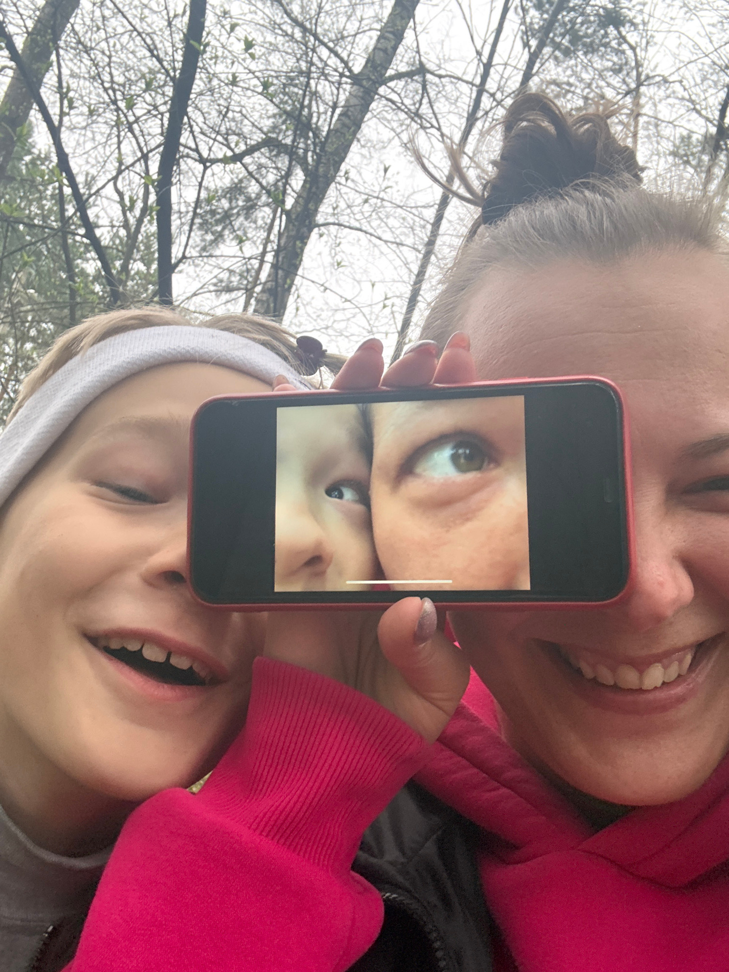 An inverted portrait-oriented image shows two individuals, likely an adult and a child, positioned side-by-side, smiling broadly with their mouths open, revealing teeth. The camera captures them from…read more