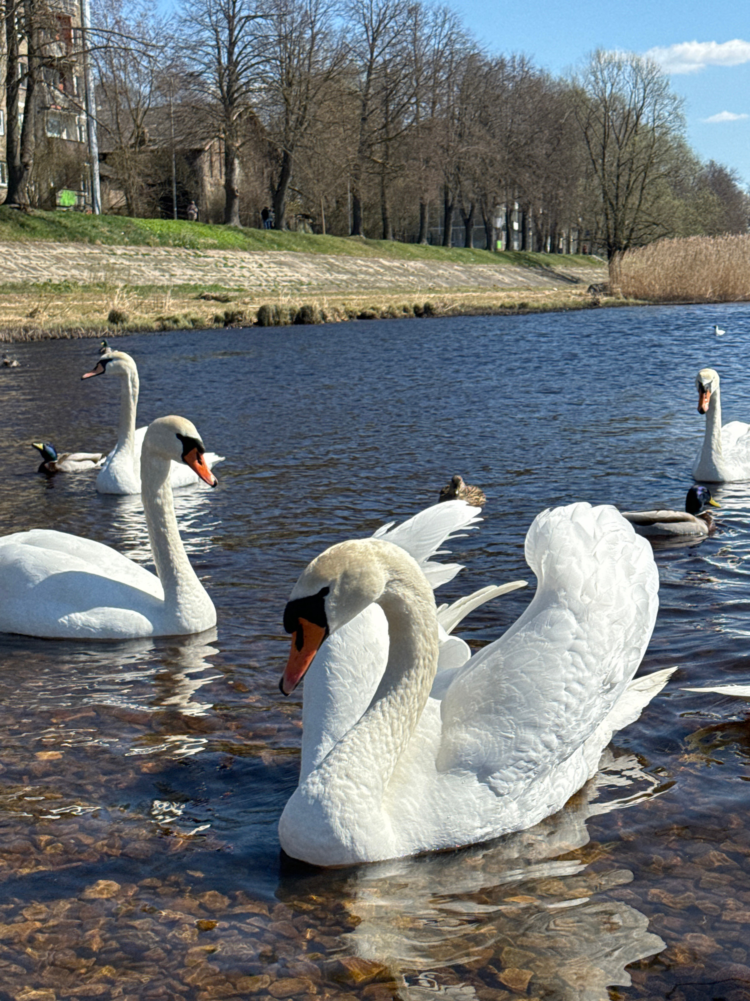 The image depicts a group of swans in a body of water. Several swans are visible, exhibiting their white plumage and characteristic long necks. Some of the swans are actively feeding or preening. The…read more