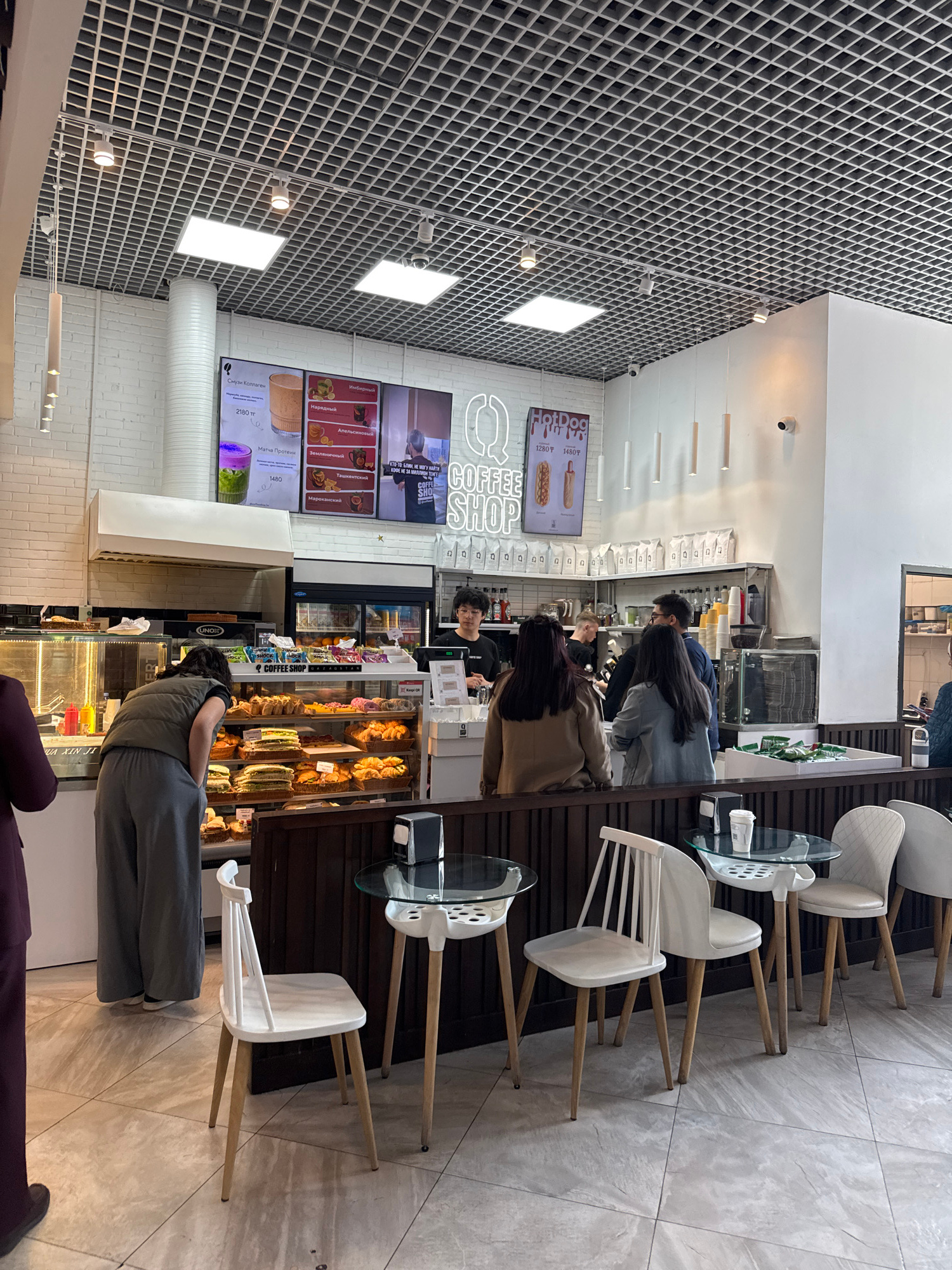 This image depicts the interior of a modern coffee shop or cafe, likely located in Almaty, Kazakhstan, as indicated by the currency and language. The scene features a long service counter with a displ…read more