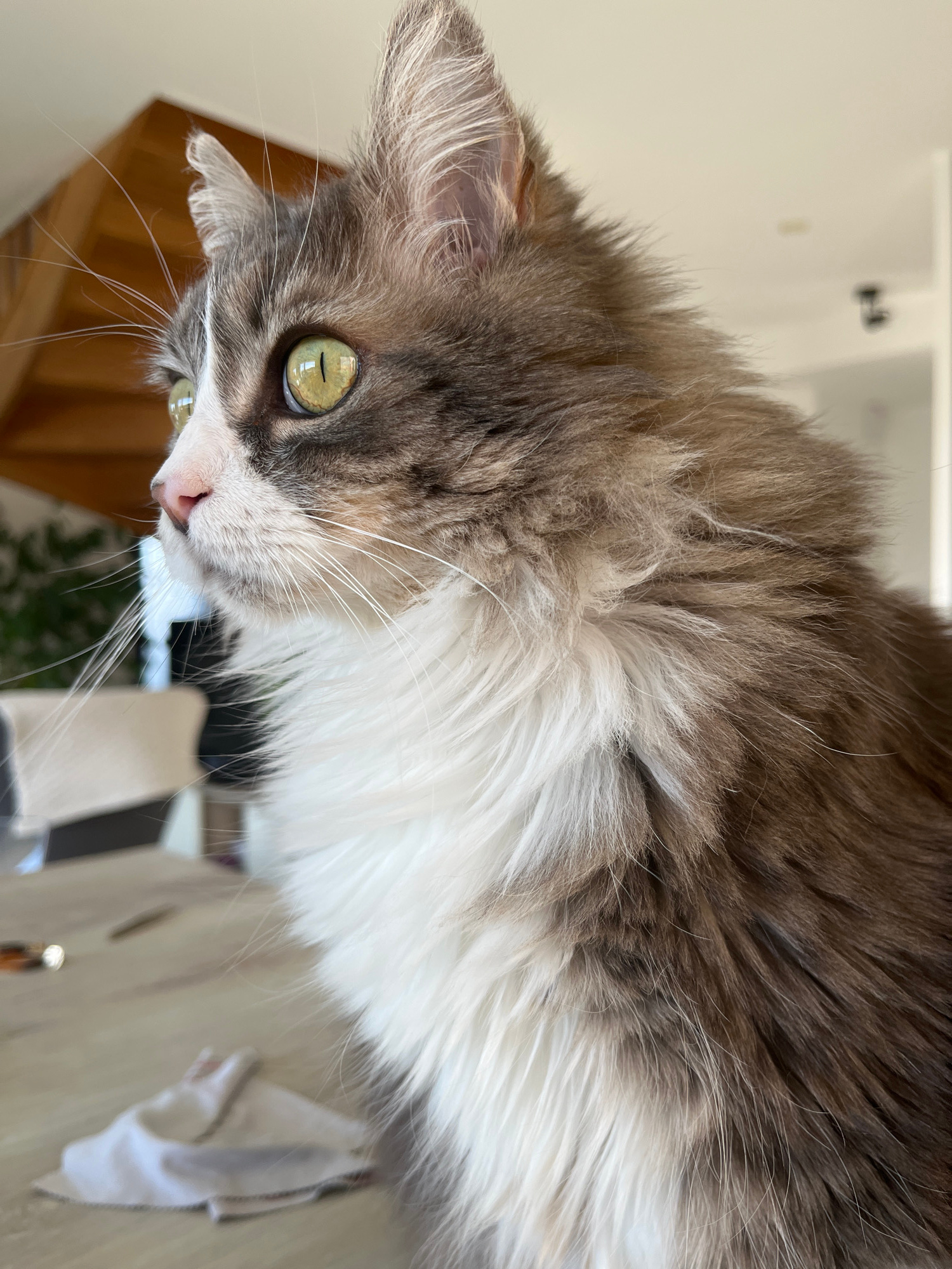 A medium-sized cat with grey and white fur is shown in a close-up shot. The cat has light green eyes and a pink nose. The background is blurred, showing elements of a room including a chair and table,…read more