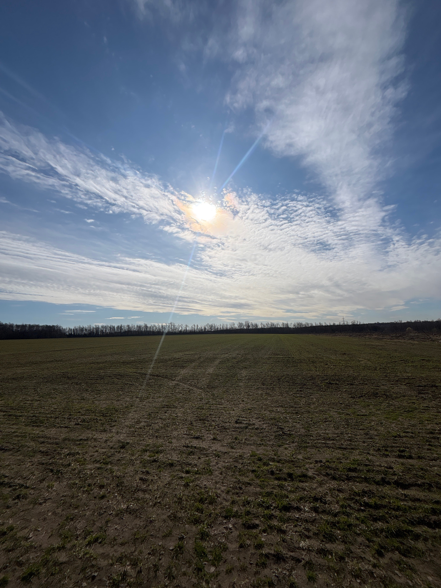 The image shows an agricultural field under a partly cloudy sky with the sun shining through. A line of trees separates the field from the sky. The location is Раздолье, Russia.
