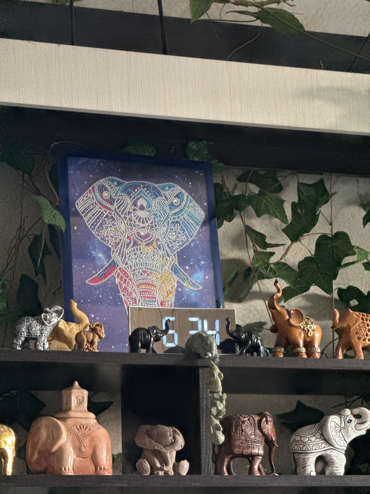 The image shows a shelf decorated with elephant figurines. There are several shelves visible, each containing multiple figurines of varying sizes and colors. The figurines appear to be made of differe…read more