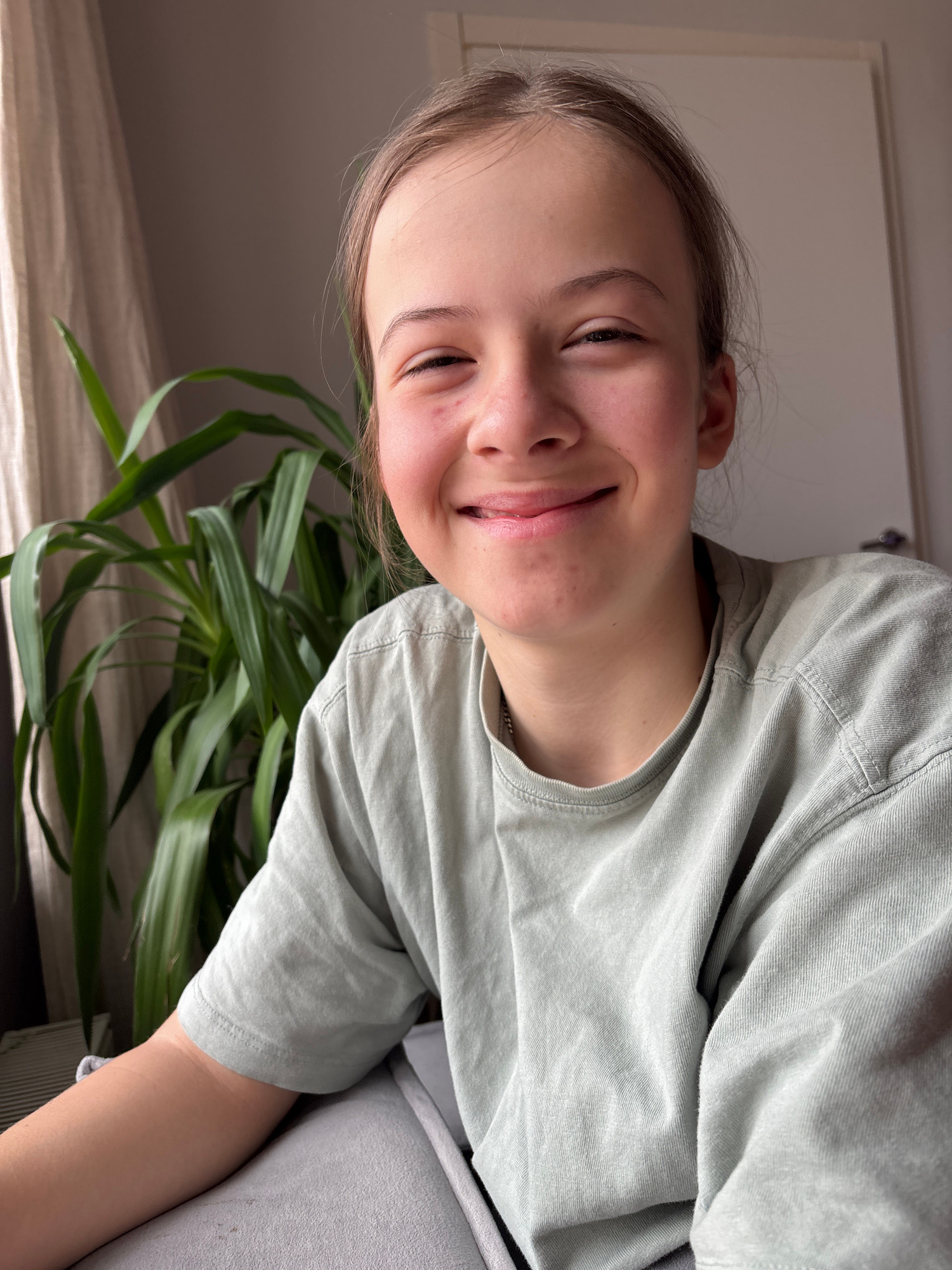 A young person with fair skin, light brown hair pulled back, and wearing a light green t-shirt is smiling slightly with eyes closed. They are indoors with a large leafy plant visible in the lower port…read more