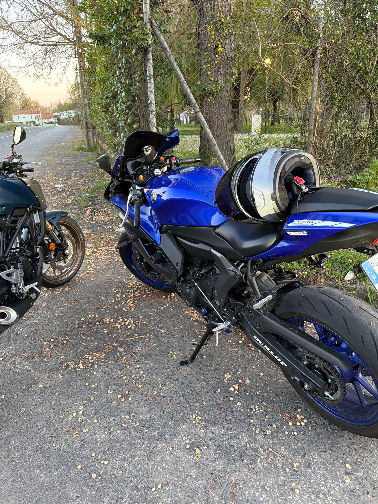 The image shows two parked motorcycles on a paved road, possibly near Mirandela, Portugal. One motorcycle is blue, with a silver and black helmet resting on its seat. The other motorcycle is darker, w…read more