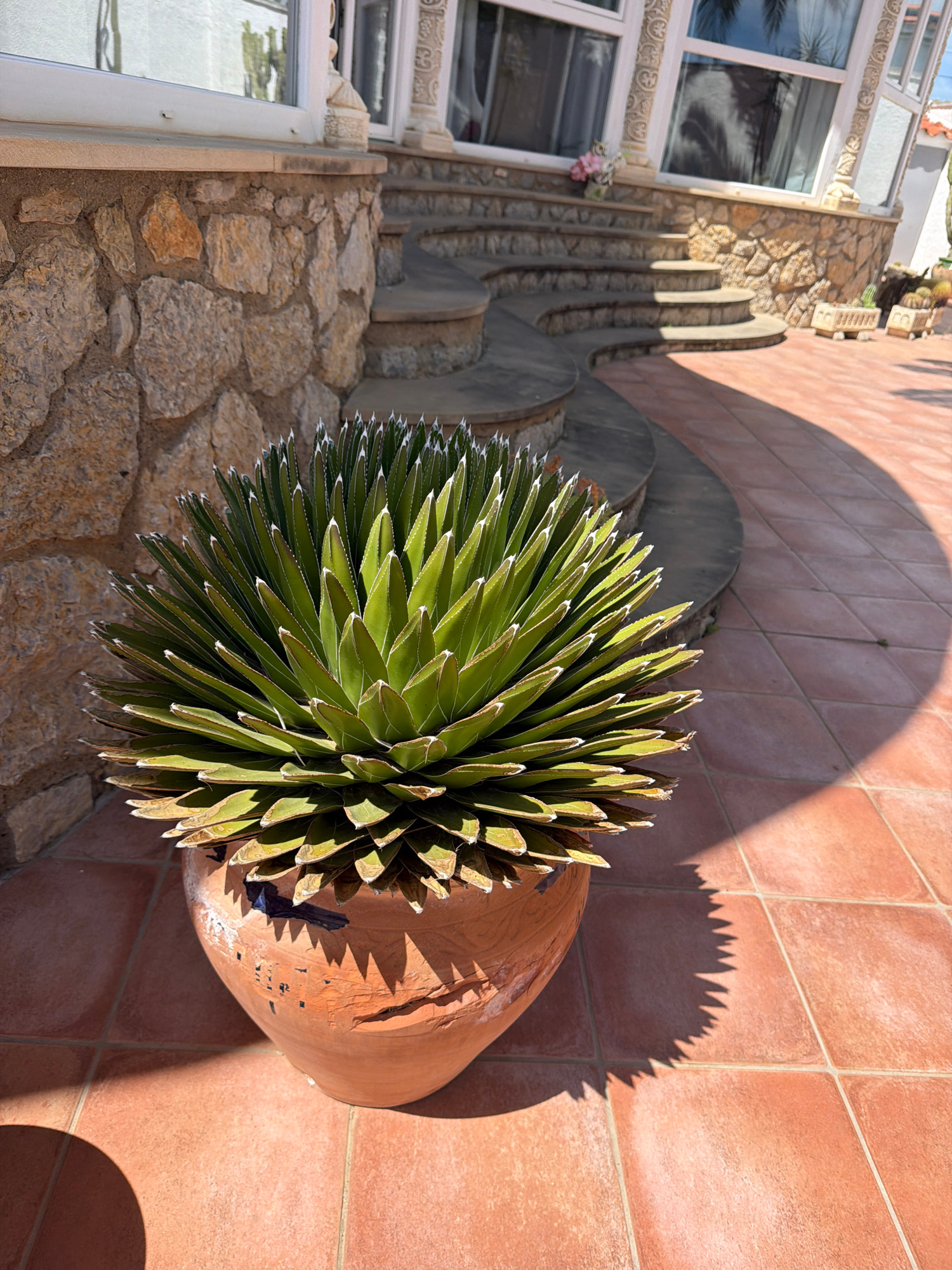 This outdoor scene, likely in Mont-roig del Camp, Spain, shows a large potted Agave plant occupying the foreground. The agave is characterized by its dense rosette of green, pointed leaves with white…read more