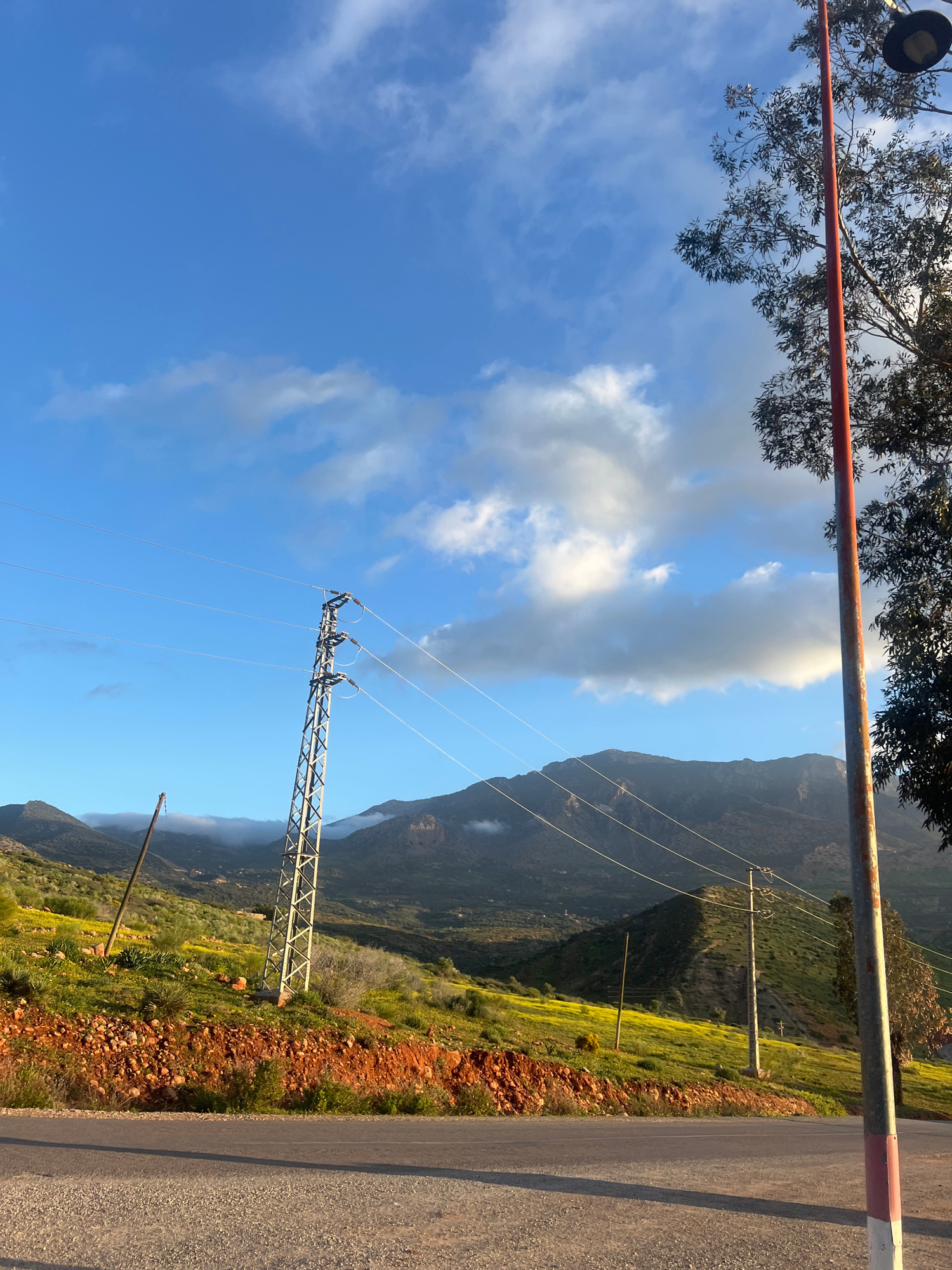 The image depicts a landscape in Ouaouizert, Morocco, featuring a partly cloudy sky, mountains, and power lines. A metal utility pole stands prominently in the scene. A paved road is visible on the ri…read more