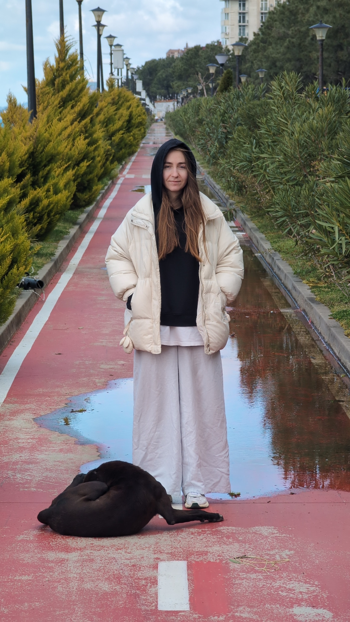 A young woman stands on a red walking/bike path in Kobuleti, Georgia. She wears a beige puffer jacket over a black hooded sweatshirt, light-colored pants, and white shoes. To her right, a black dog li…read more