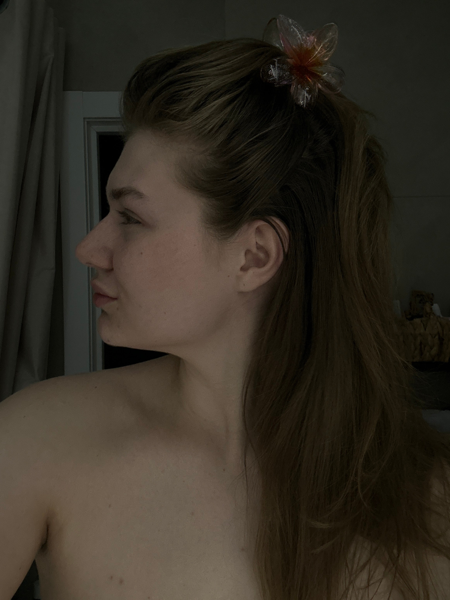 A close-up image shows a person with long brown hair, wearing a translucent flower clip in their hair. The person is positioned near a window. Due to lack of visual evidence, location cannot be verifi…read more