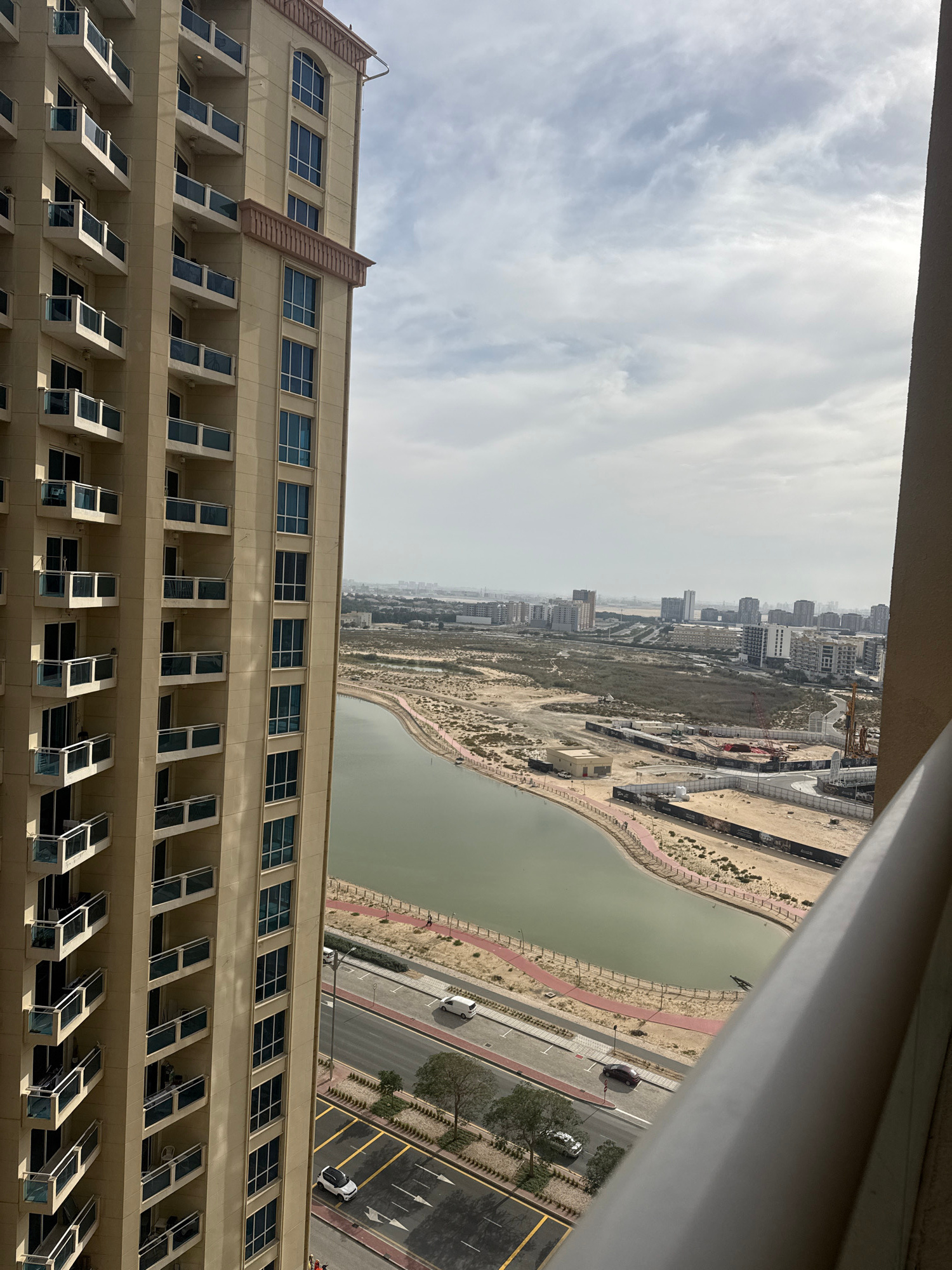 The image shows a view from a high vantage point, likely a balcony or window, in Dubai, United Arab Emirates. In the foreground, a multi-story building with beige exterior walls and rows of windows is…read more