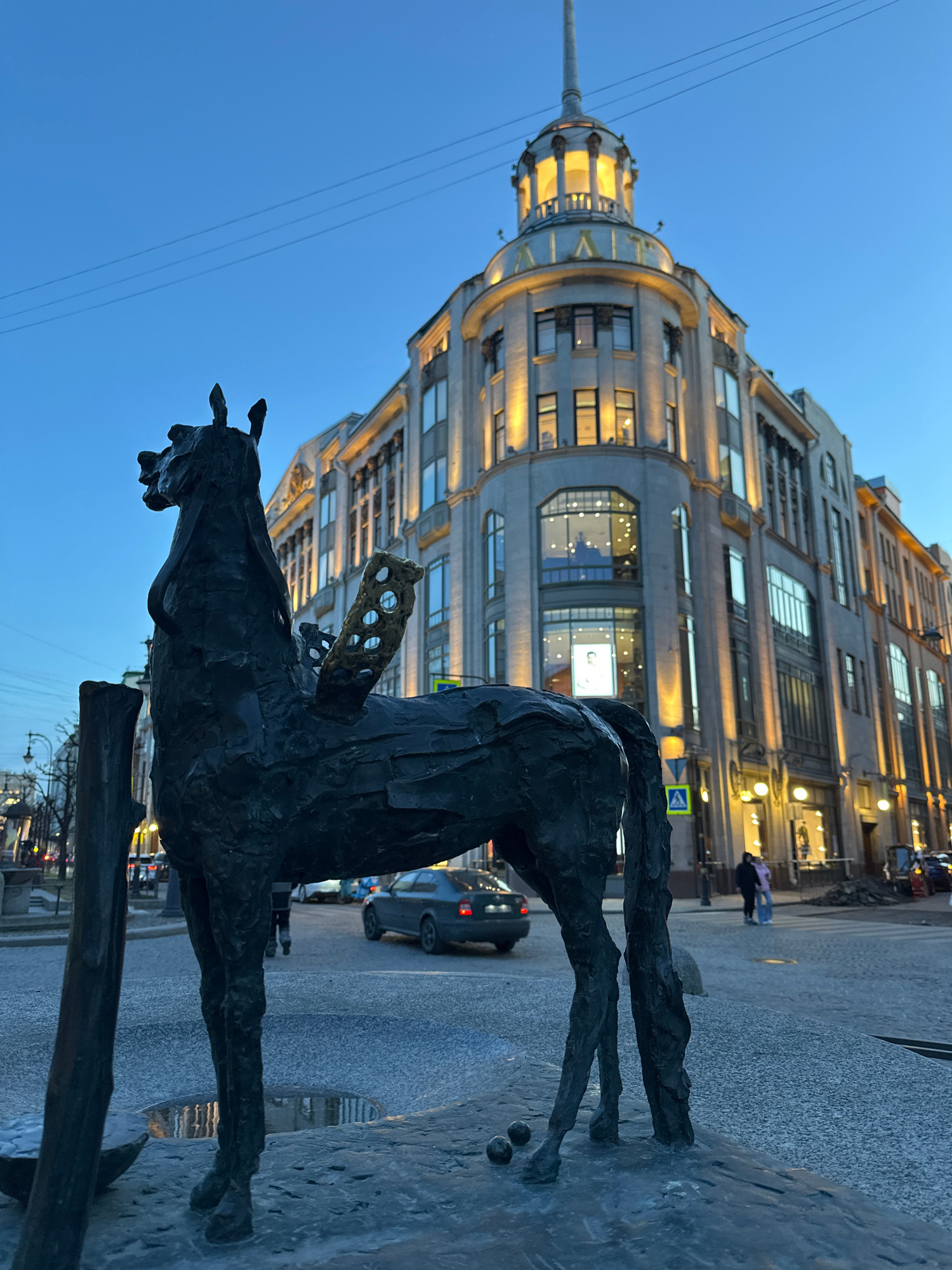 The image shows a bronze sculpture of a horse in Saint Petersburg, Russia. The building in the background is the House of the Singer Company. The sculpture stands near a street with pedestrian and veh…read more