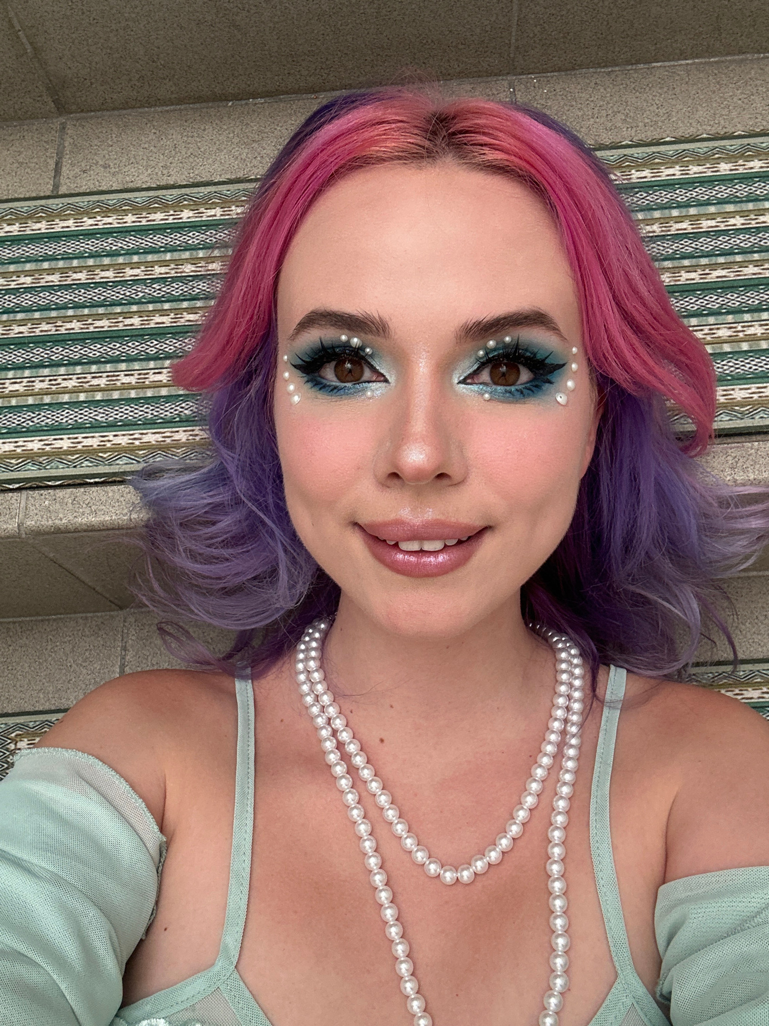 A young woman with pink and purple hair lies on a surface with a patterned rug, possibly steps, wearing light blue clothing and a double strand of pearls. She has blue eye makeup with small pearl acce…read more