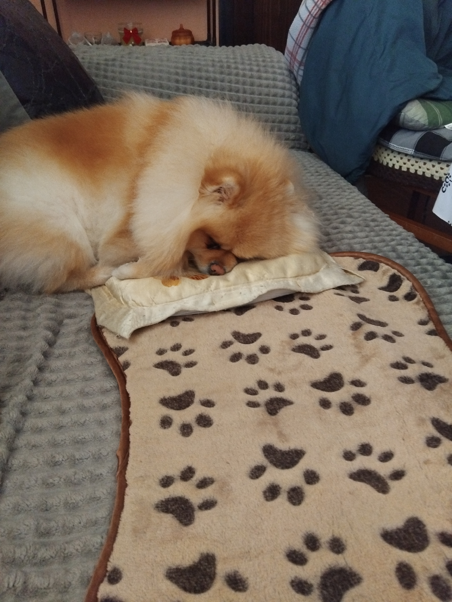 A Pomeranian dog lies curled on a grey textured sofa, resting its head on a cream-colored fabric. Adjacent to the dog is a dog bed with brown paw prints on a light tan background, bordered with brownβ¦read more