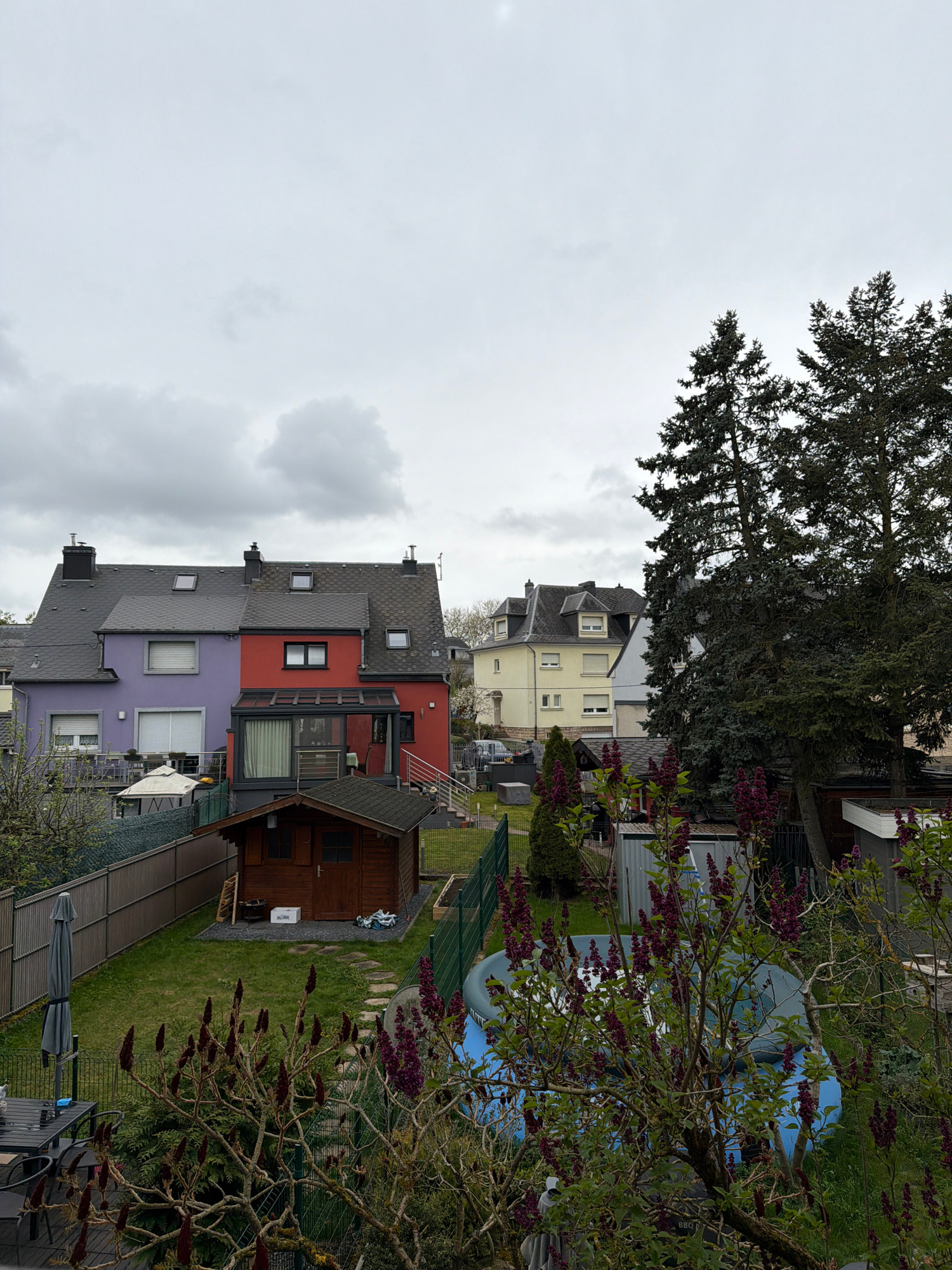 The image depicts a residential area in Esch-sur-Alzette, Luxembourg, under an overcast sky. Several houses with varying architectural styles and colors (purple, red, yellow) are visible. A large tree…read more