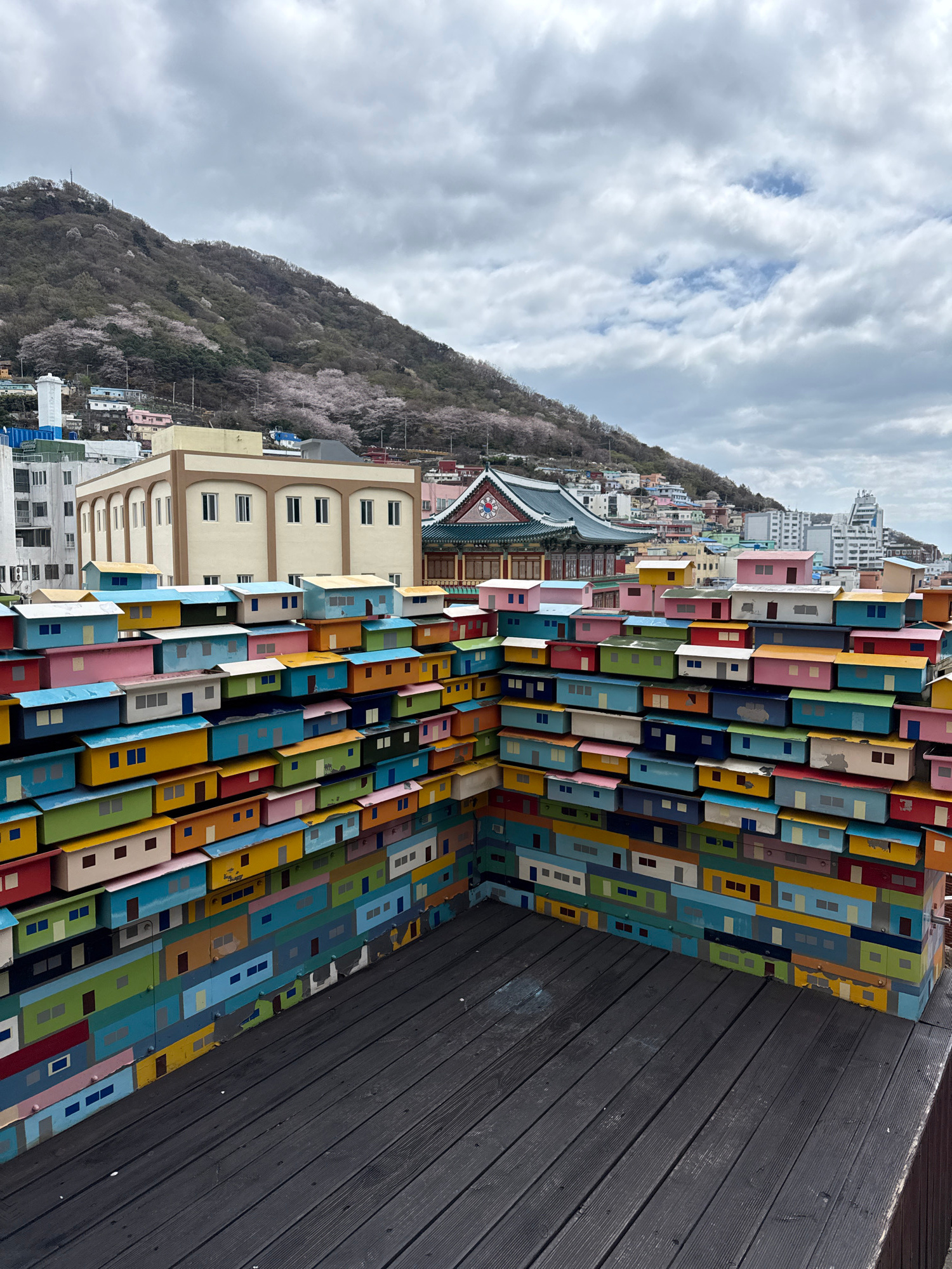 The image shows a cityscape in Busan, South Korea, with a colorful art installation in the foreground. On the right, a wooden deck stretches out of view. To its left, an art installation resembling s…read more