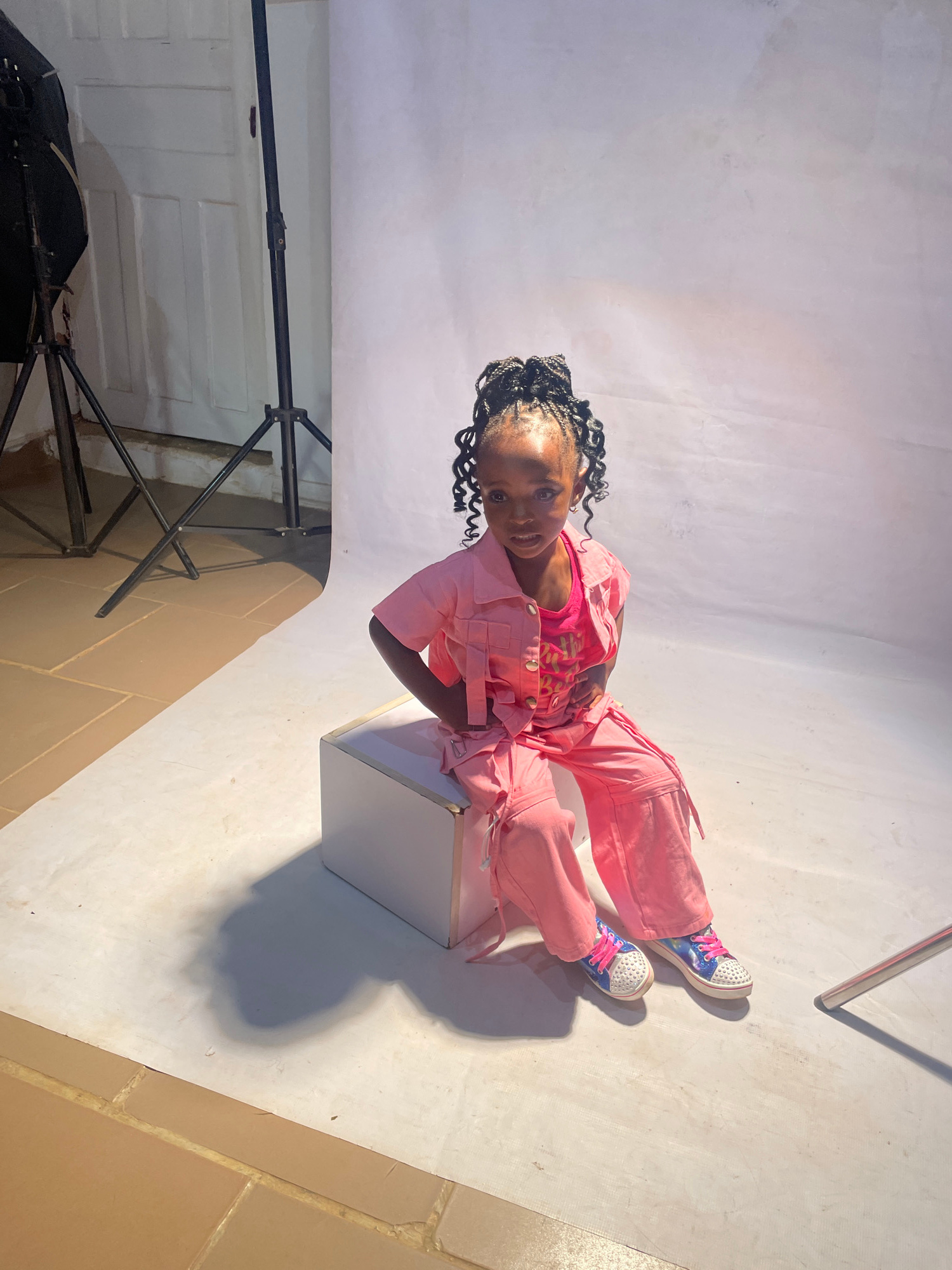A young girl with braided hair is sitting on a white cube in a studio setting. She is wearing a pink jumpsuit over a pink top and colorful sneakers. The studio has a white backdrop and floor, and phot…read more