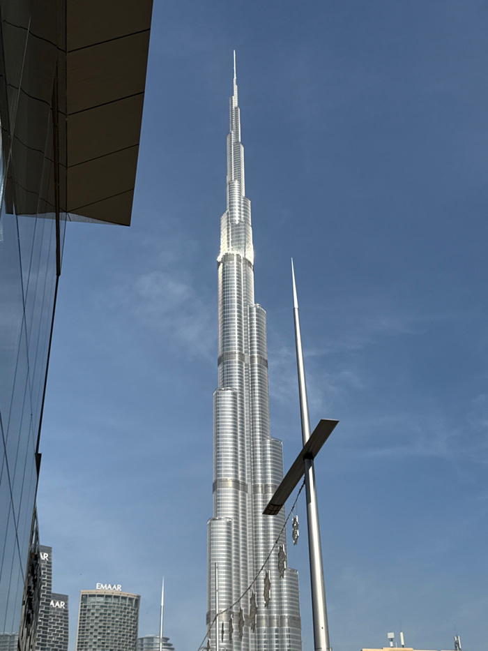 A low-angle shot shows the Burj Khalifa soaring high against a blue sky with wispy clouds. A modern building with glass panels occupies the lower left, reflecting the sky and surrounding structures. M…read more