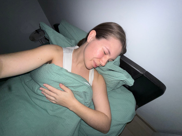 A female individual is depicted lying in a bed in a dimly lit room within the city of Vozdovac Urban Municipality, Serbia. She has light skin, brown hair pulled back, and her eyes are closed, indicati…read more