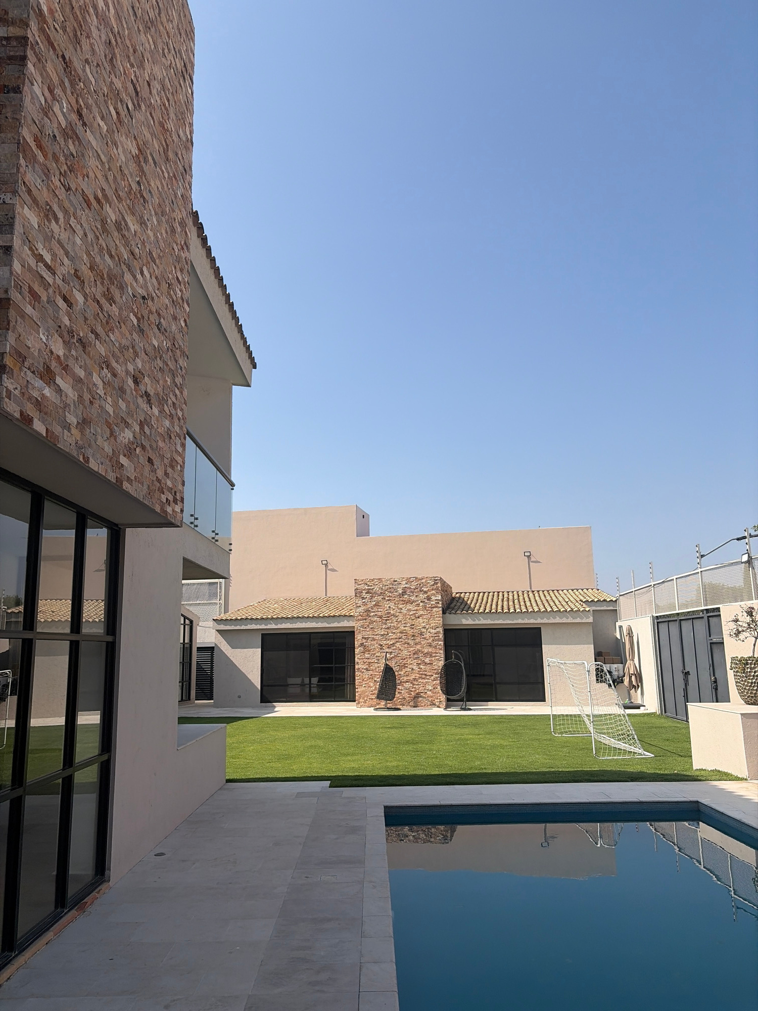 The image shows an exterior view of a modern house with a swimming pool. The house features a mix of materials including light-colored stucco, brick veneer, and large glass windows. A grassy area is v…read more