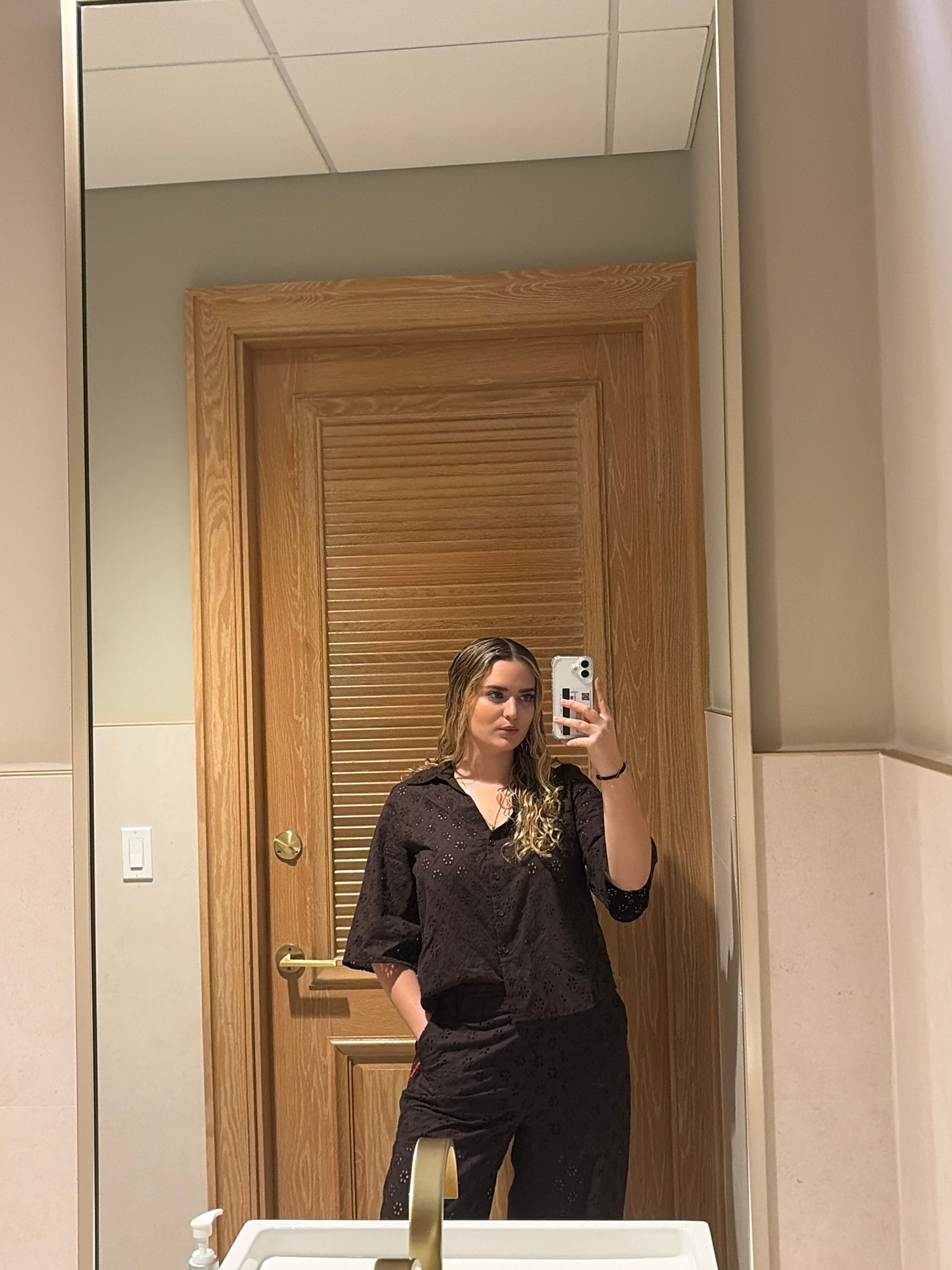 A photo in a bathroom setting, featuring a woman holding a smartphone in front of a mirror. The background consists of beige cabinets and a light brown, wood-paneled door. The presence of a bathroom sā¦read more