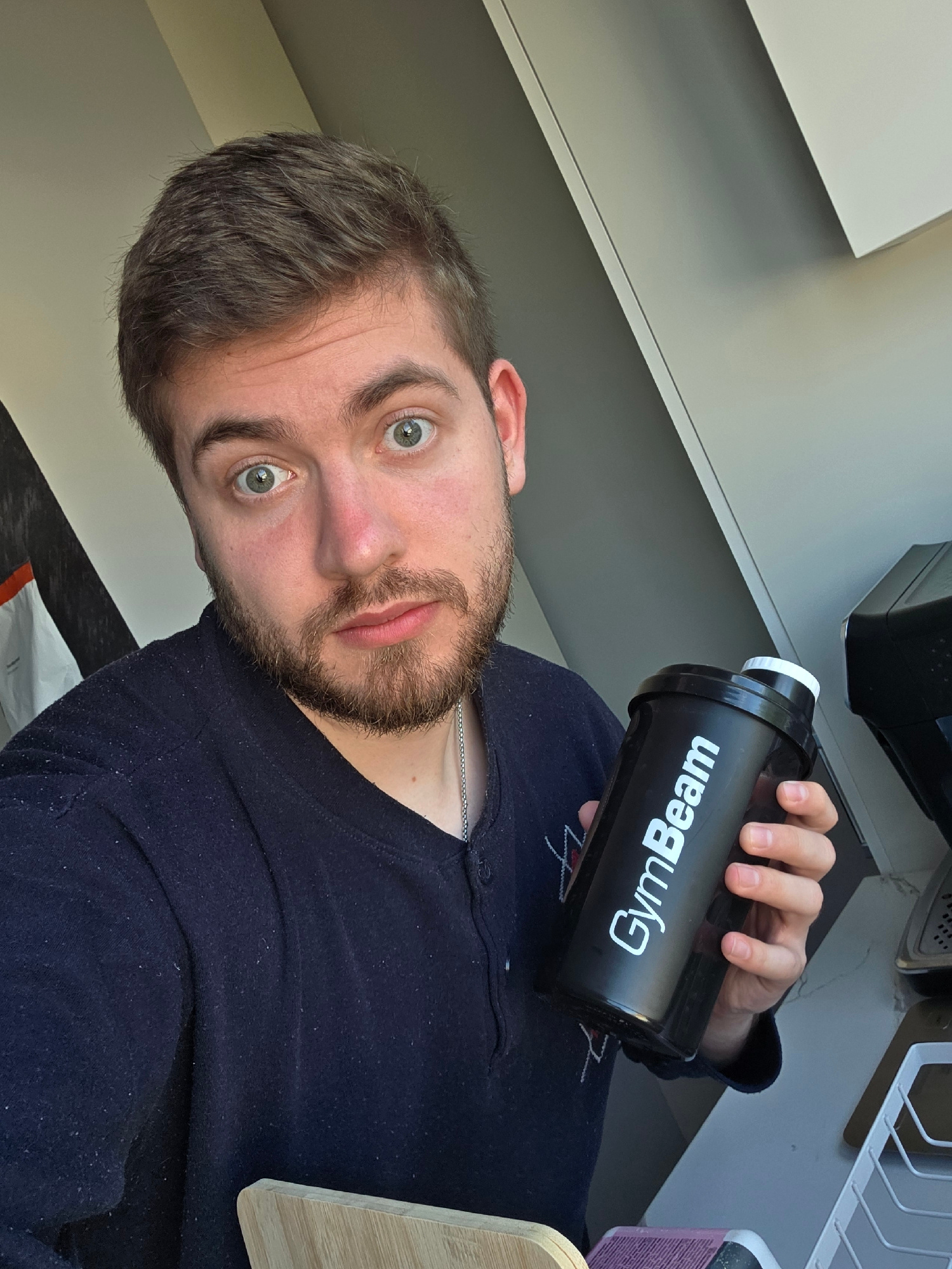 A man is holding a black GymBeam shaker bottle. The man has short brown hair, green eyes, and a beard. He is wearing a dark blue shirt. The background appears to be a kitchen setting, with a light-col…read more