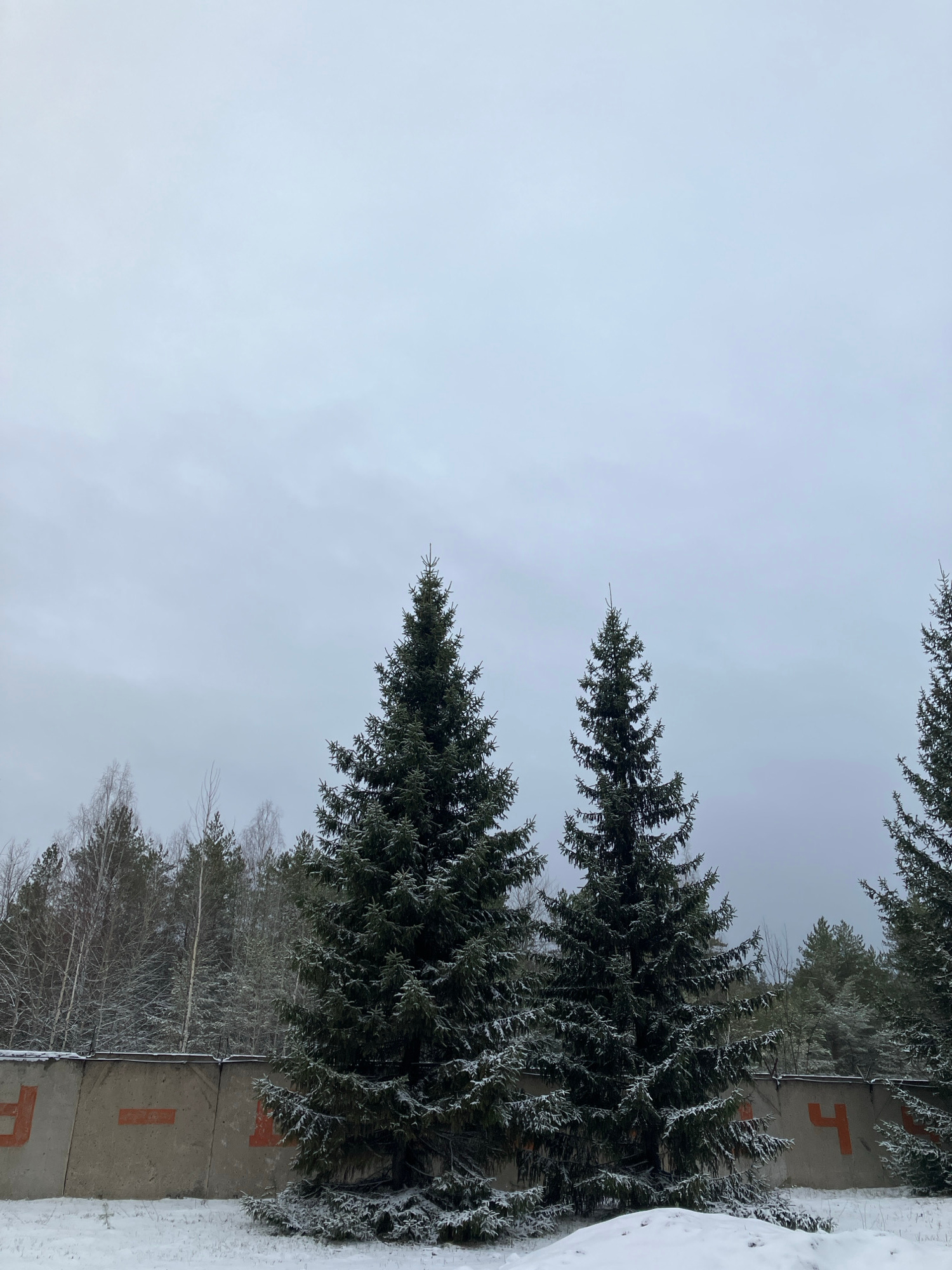 The image depicts a winter scene in Noviy, Russia. Several snow-covered evergreen trees are visible against a gray, overcast sky. A concrete wall with red markings (likely letters or numbers) runs alo…read more