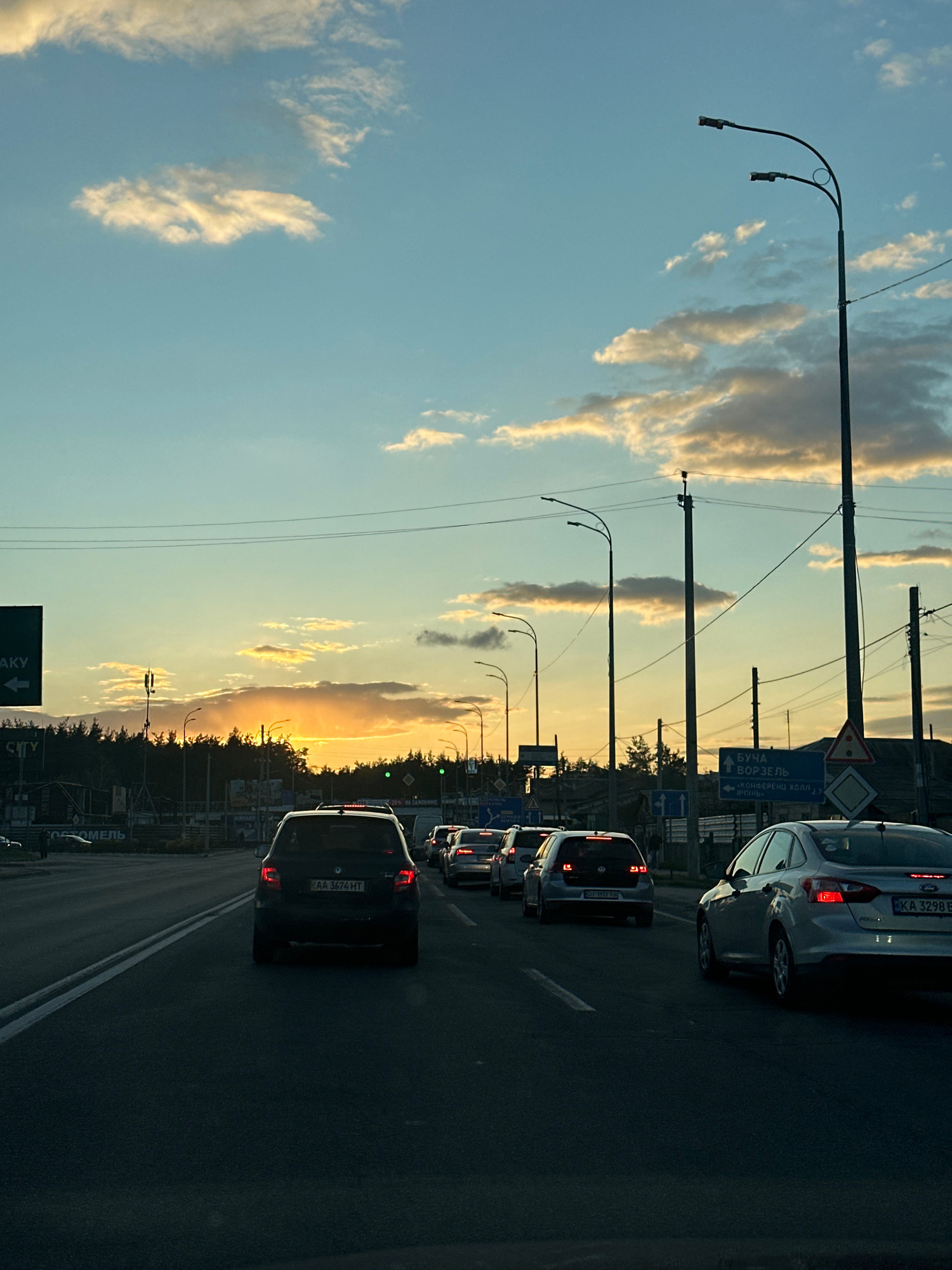 The image, rotated 90 degrees clockwise from its original orientation, displays a road scene at what appears to be sunset or sunrise. The sky, occupying the upper portion of the frame, transitions fro…read more