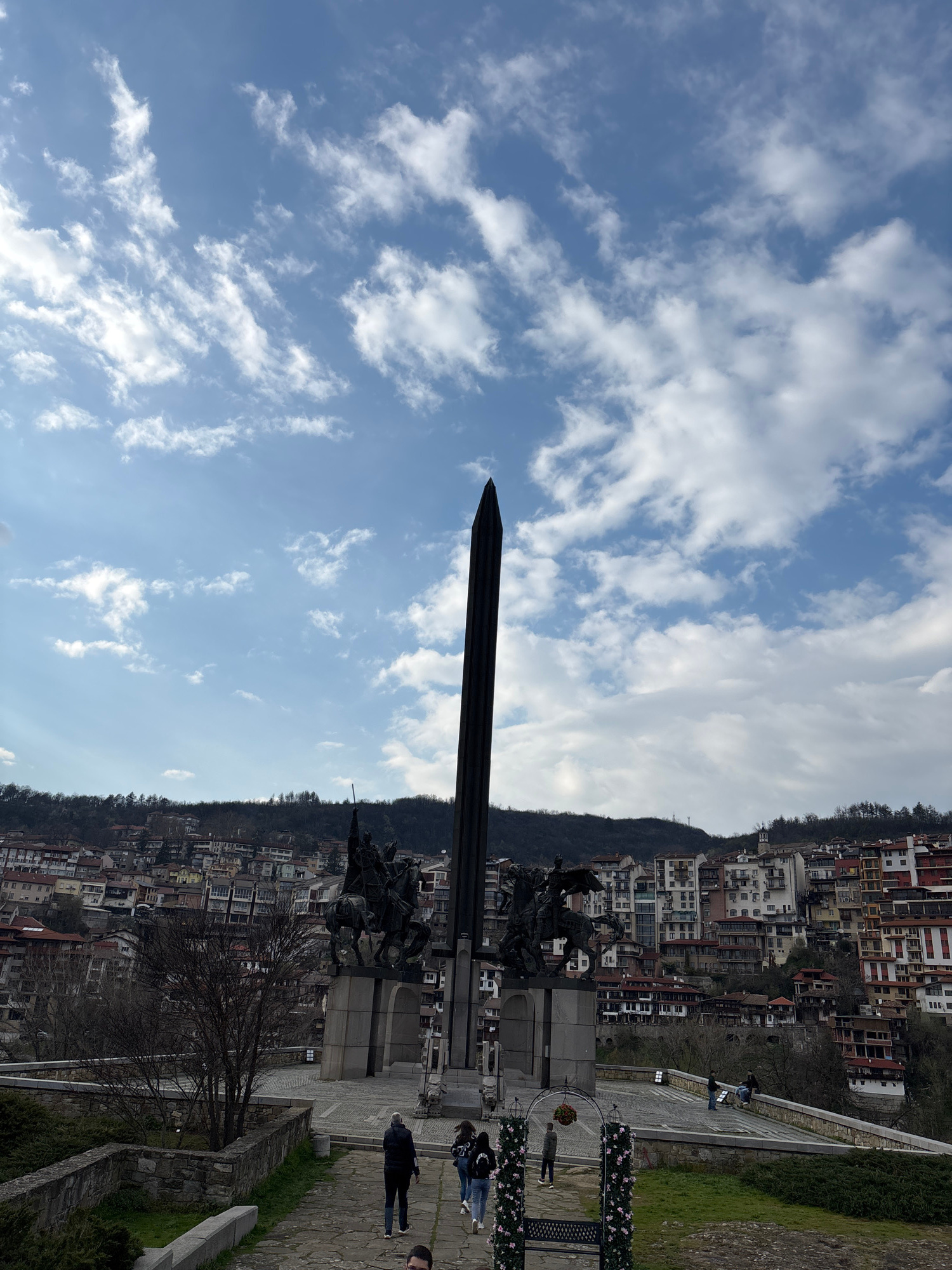 The image captures a view of Veliko Tarnovo, Bulgaria, featuring the Asenevtsi Monument. A tall, dark obelisk, part of the monument, dominates the left side of the frame, reaching into a sky filled wi…read more