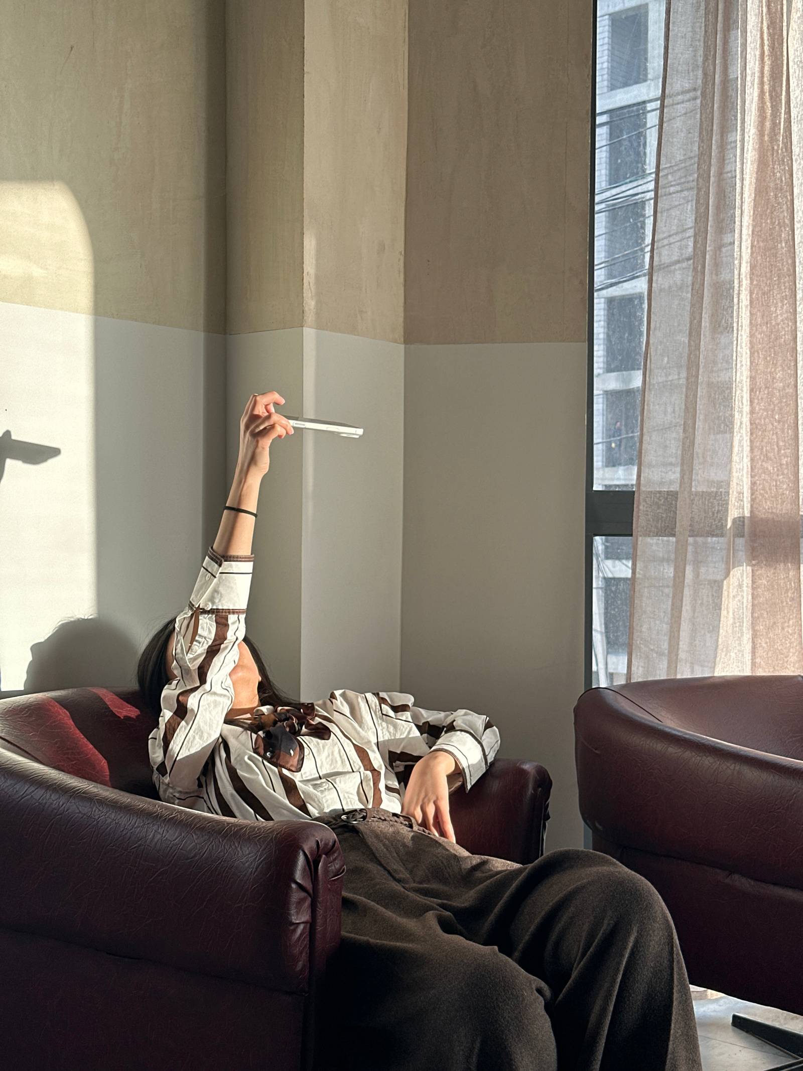 An interior scene in Zovuni, Armenia, features one individual reclining in a dark red leather armchair. The person, appearing female, has long dark hair and wears a white collared shirt with brown ver…read more