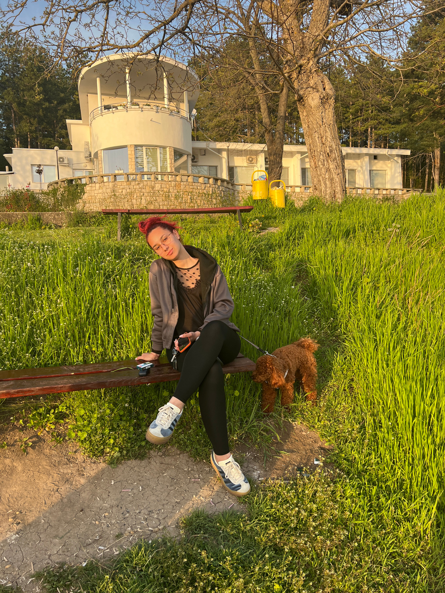 A young woman with short, reddish hair and glasses is seated on a wooden bench in an outdoor setting during the golden hour. She wears a dark top, a grey jacket, black leggings, and light-colored snea…read more