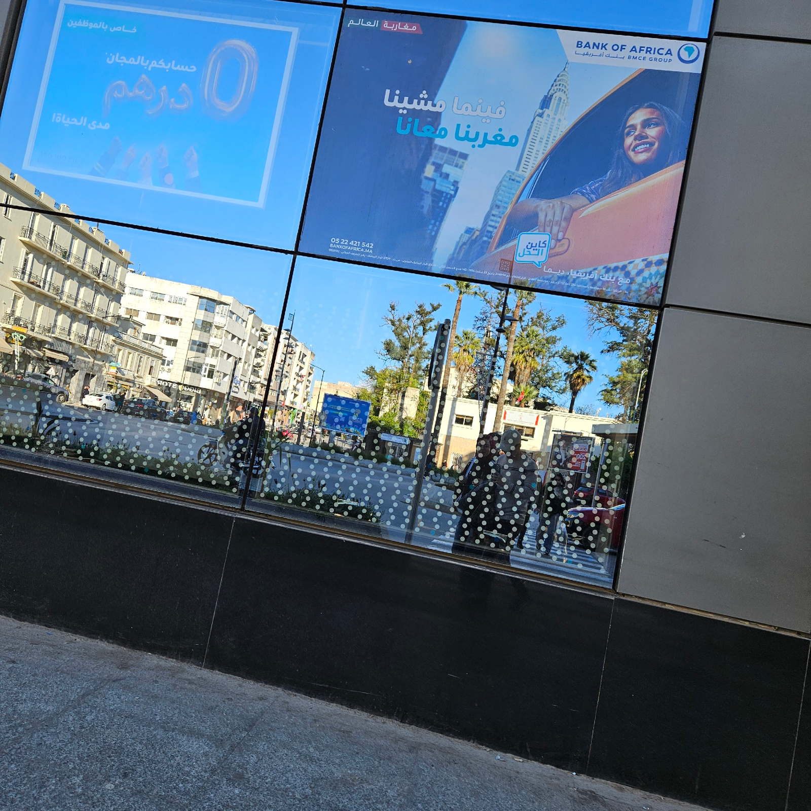 The image shows a reflection in a window with white polka dots. The window displays Bank of Africa advertisements in Arabic, featuring a woman, a city skyline, and promotional text. The reflection revβ¦read more