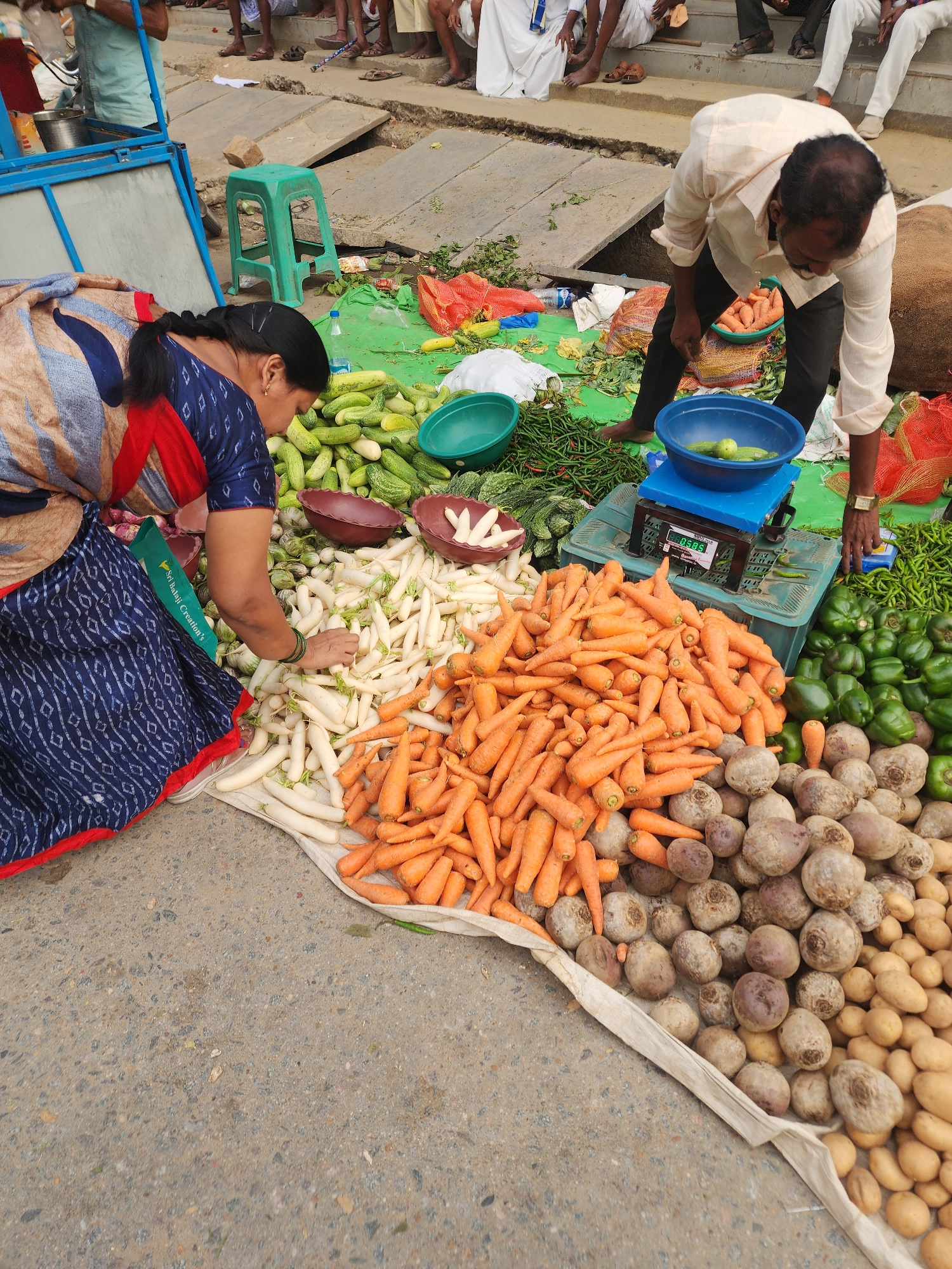 The image depicts an outdoor vegetable market stall situated on a concrete surface in Puttaparthi, India. In the foreground, a woman wearing a blue patterned saree with a red border is bent over, usinβ¦read more