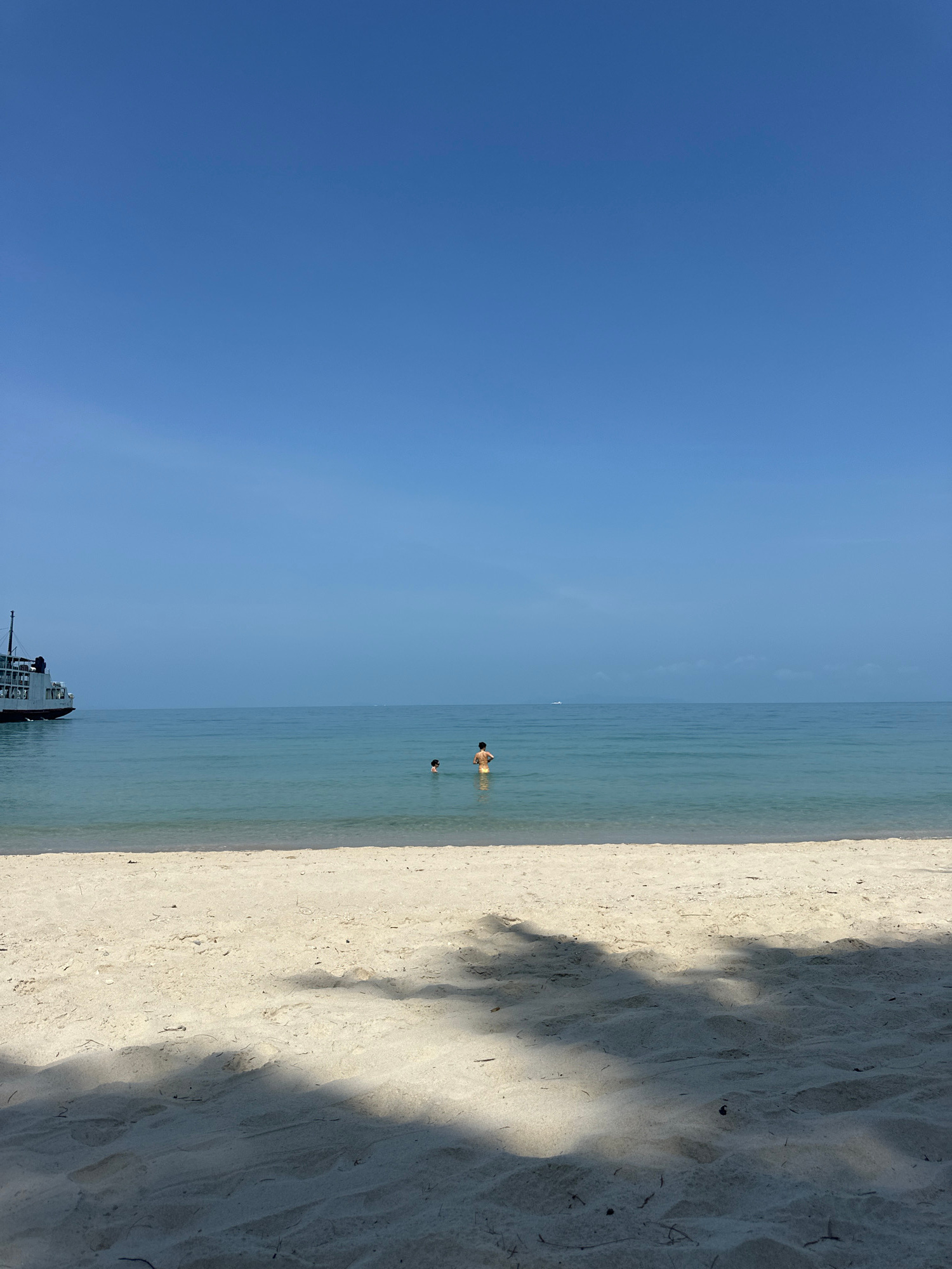 The image shows a beach scene. A bright blue sky dominates the left side of the frame. The sea stretches from the mid-left to the center, showing clear water. Two people are standing in the water near…read more