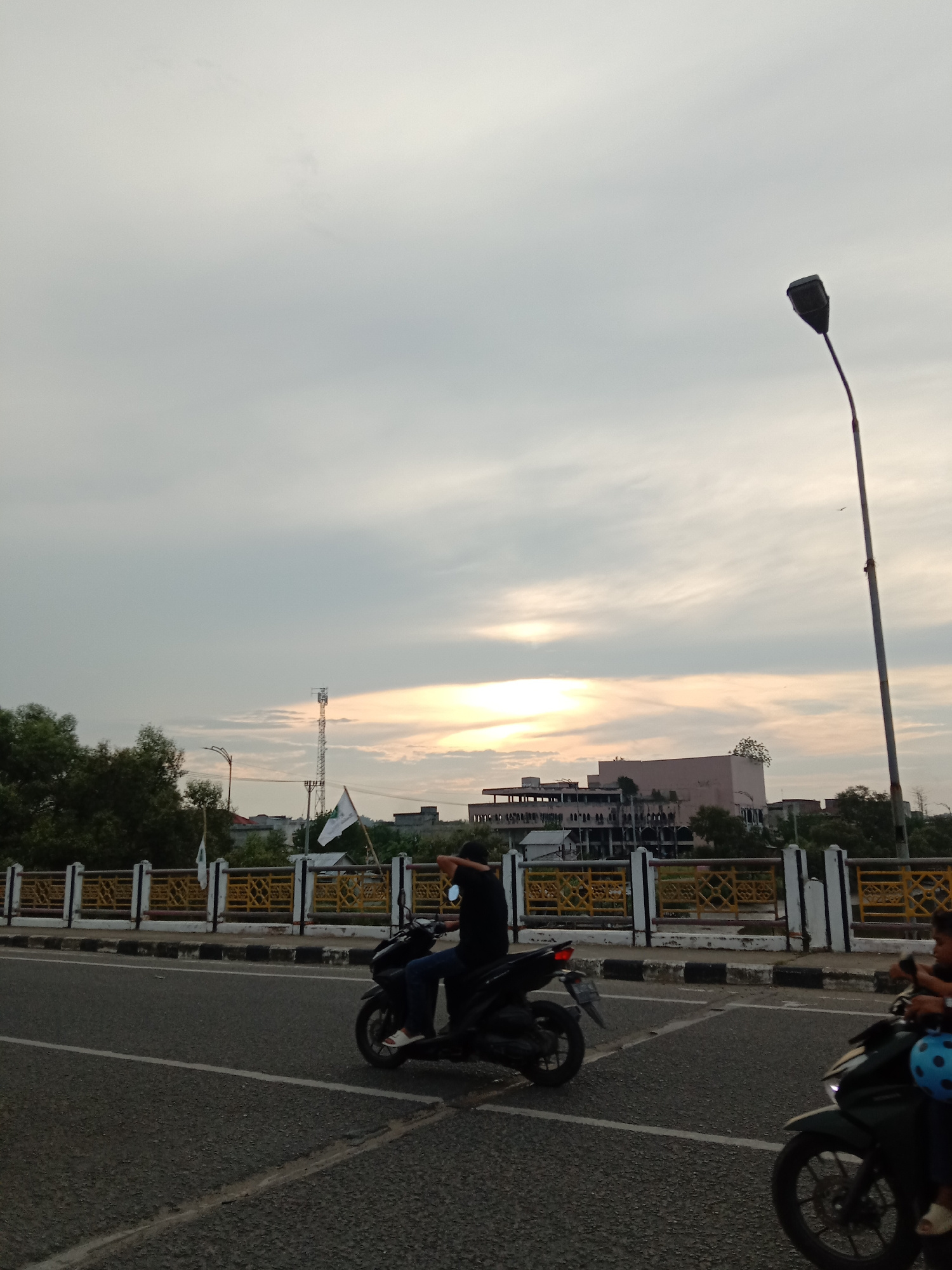 The image shows a street scene in Lhokseumawe, Indonesia. Two people are riding motorcycles. A tall street light stands on the right side of the frame. In the background are trees, a building under co…read more