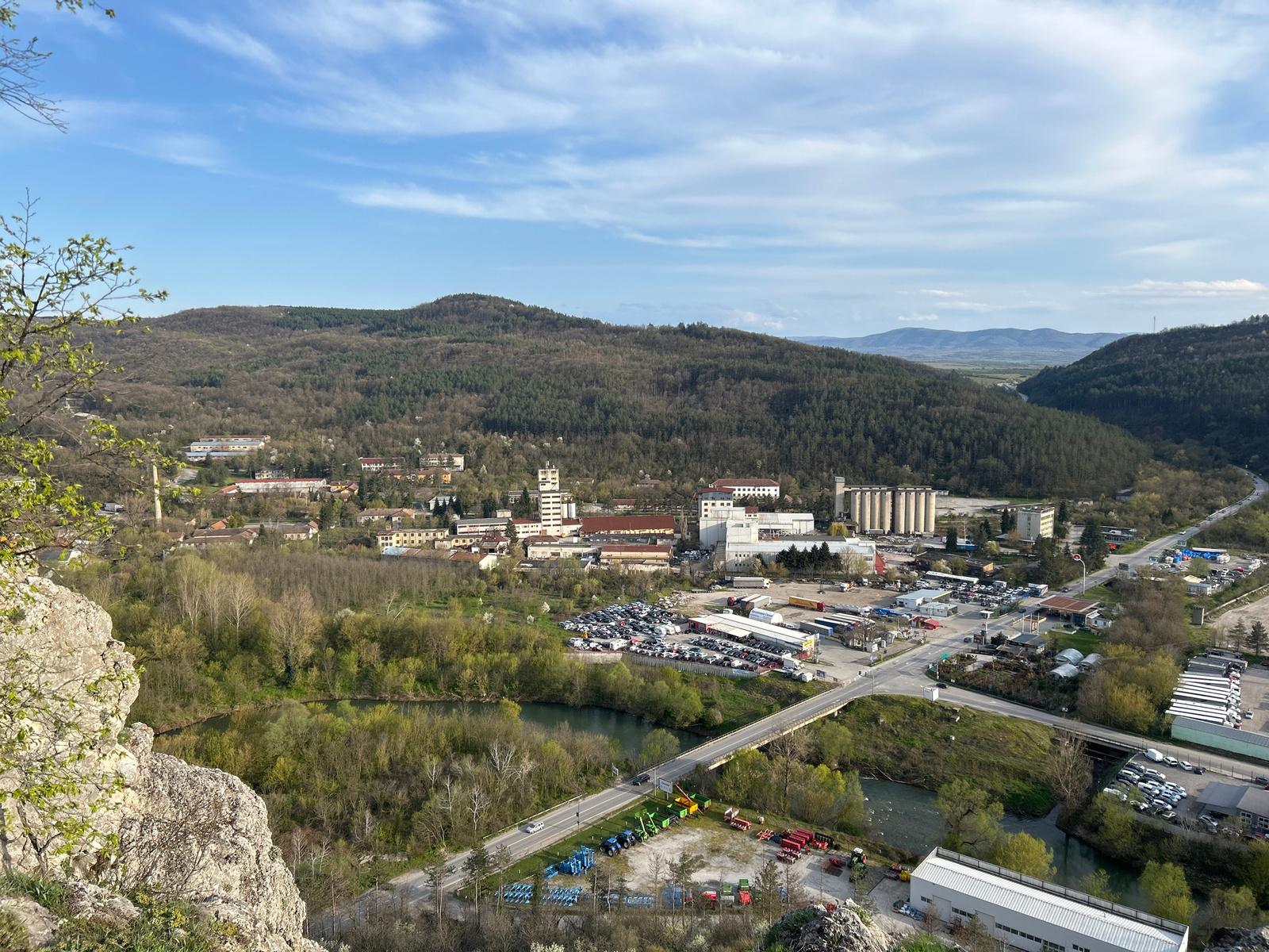 The image presents a high-angle, daytime view of a landscape in Veliko Tarnovo, Bulgaria, encompassing both natural and urban elements. In the foreground, a rocky cliff partially obscures the view. A…read more