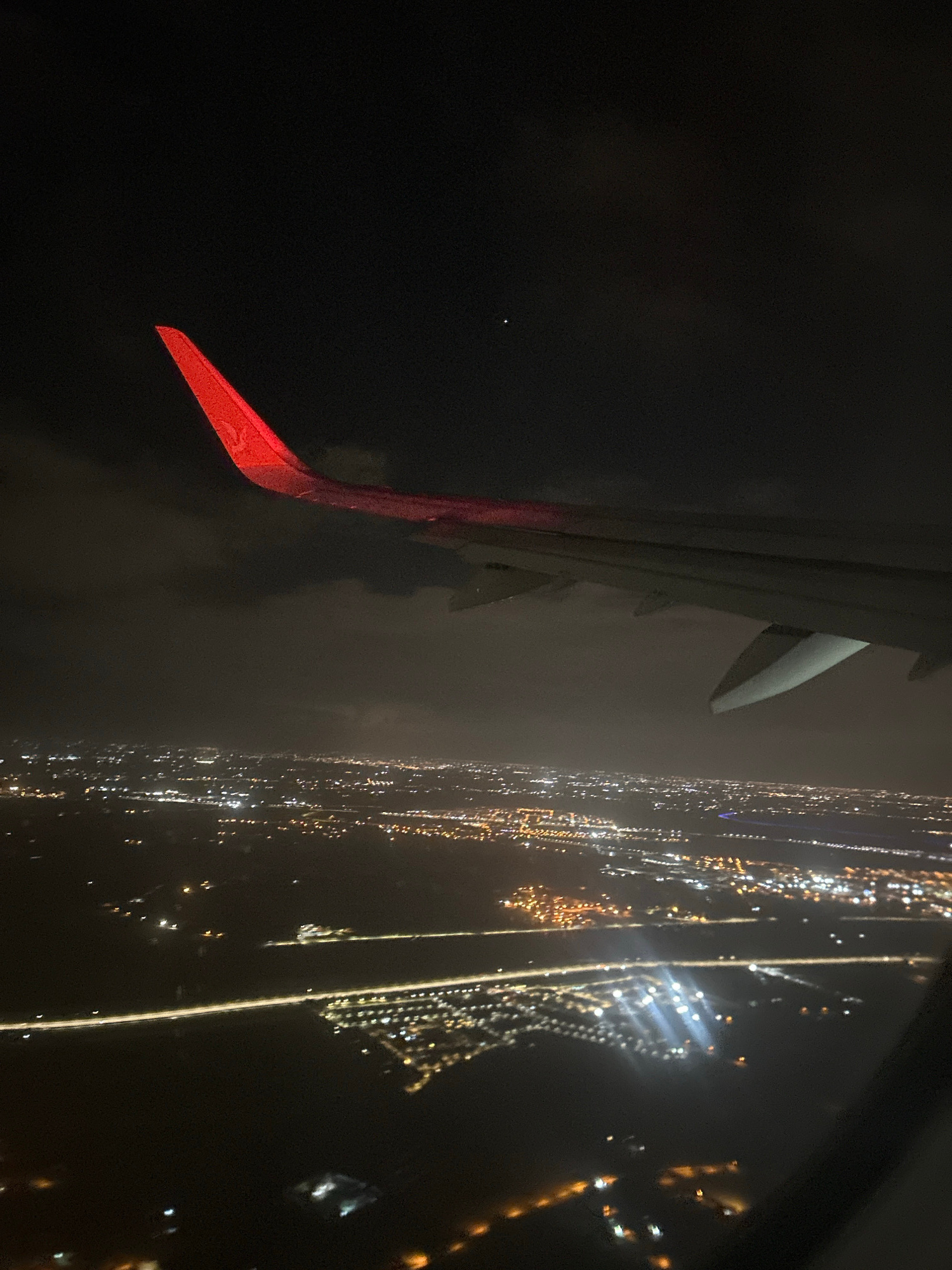 The image depicts a night aerial view from an airplane window. A portion of the aircraft wing, with a red wingtip, is visible on the left. To the right of the wing, city lights form a dense pattern, l…read more
