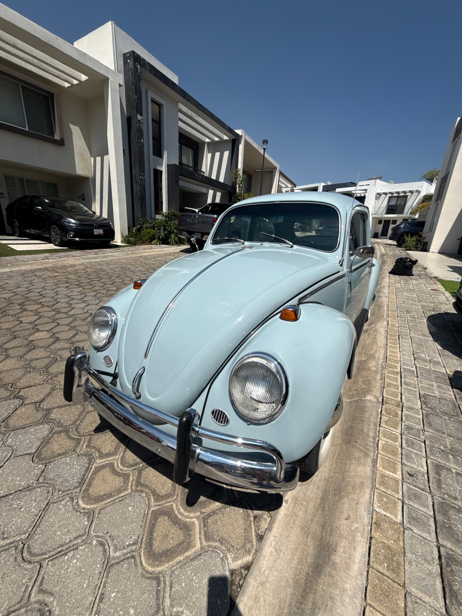 A light blue Volkswagen Beetle is parked on a paved street in Santa Clara Ocoyucan, Mexico. The car is angled towards the viewer and parked next to a modern-style building with white walls and dark ac…read more