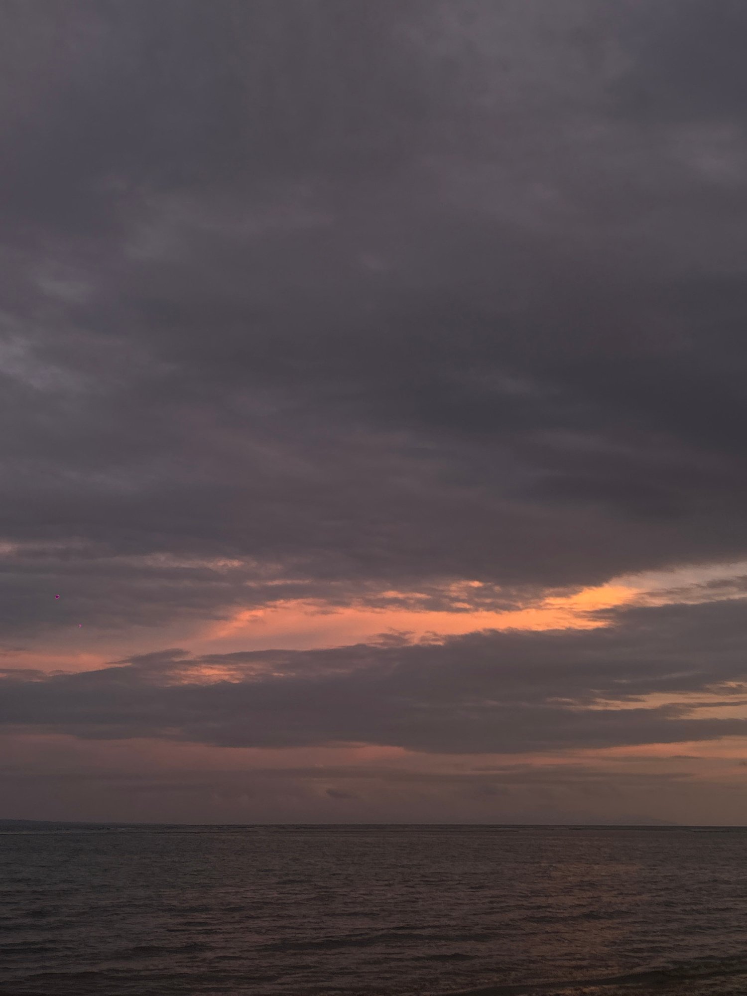 The image depicts a seascape taken at Sainte-Anne, France, featuring the ocean on the right side and a cloudy sky on the left. The clouds are a mix of dark grey and light orange, suggesting either a s…read more